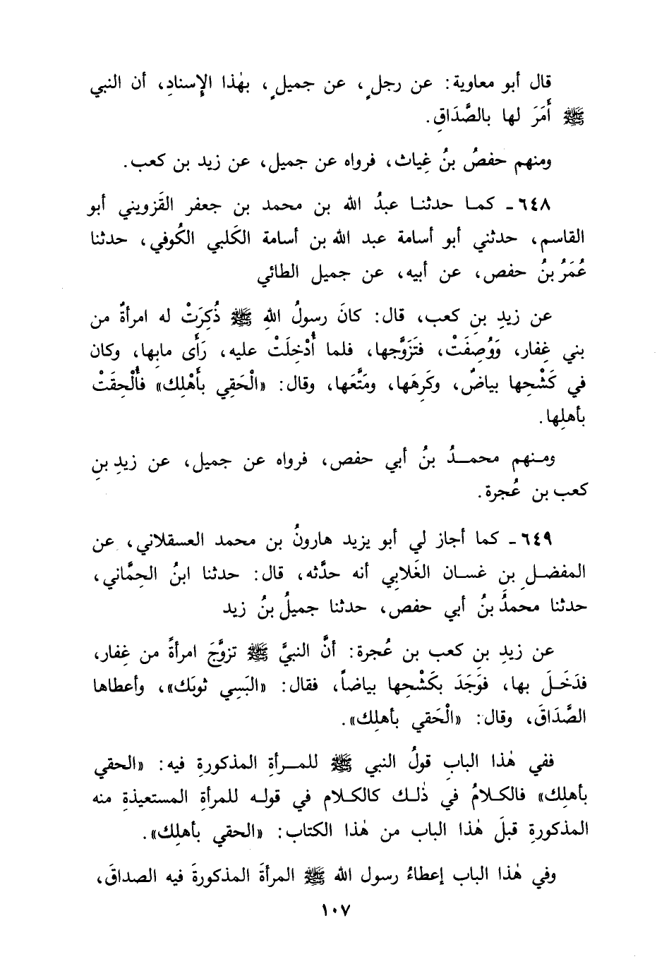 648 - كَمَا حَدَّثَنَا عَبْدُ اللهِ بْنُ مُحَمَّدِ بْنِ جَعْفَرٍ الْقَزْوِينِيُّ أَبُو الْقَاسِمِ، حَدَّثَنِي أَبُو أُسَامَةَ عَبْدُ اللهِ بْنُ أُسَامَةَ الْكَلْبِيُّ الْكُوفِيُّ، حَدَّثَنَا عُمَرُ بْنُ حَفْصٍ، عَنْ أَبِيهِ، عَنْ جَمِيلٍ الطَّائِيِّ، عَنْ زَيْدِ بْنِ كَعْبٍ قَالَ: كَانَ رَسُولُ اللهِ صَلَّى اللَّهُ عَلَيْهِ وَسَلَّمَ ذُكِرَتْ لَهُ امْرَأَةٌ مِنْ بَنِي غِفَارٍ وَوُصِفَتْ فَتَزَوَّجَهَا، فَلَمَّا أُدْخِلَتْ عَلَيْهِ رَأَى مَا بِهَا وَكَانَ فِي كَشْحِهَا بَيَاضٌ وَكَرِهَهَا وَمَتَّعَهَا وَقَالَ: " الْحَقِي بِأَهْلِكِ " فَأُلْحِقَتْ بِأَهْلِهَا " وَمِنْهُمْ مُحَمَّدُ بْنُ أَبِي حَفْصٍ فَرَوَاهُ عَنْ جَمِيلٍ، عَنْ زَيْدِ بْنِ كَعْبِ بْنِ عُجْرَةَ
