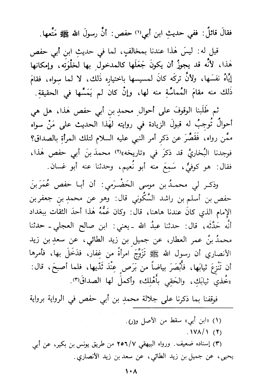 وَذَكَرَ لِي مُحَمَّدُ بْنُ مُوسَى الْحَضْرَمِيُّ أَنَّ أَبَا حَفْصٍ عُمَرَ بْنَ حَفْصِ بْنِ أَسْلَمَ بْنِ رَاشِدٍ السَّكُونِيَّ قَالَ: وَهُوَ عَنْ مُحَمَّدِ بْنِ جَعْفَرِ بْنِ الْإِمَامِ الَّذِي كَانَ عِنْدَنَا هَاهُنَا قَالَ: وَكَانَ عَمُّهُ هَذَا أَحَدَ الثِّقَاتِ بِبَغْدَادَ أَنَّهُ حَدَّثَهُ قَالَ: حَدَّثَنَا عَبْدُ اللهِ يَعْنِي ابْنَ صَالِحٍ الْعِجْلِيَّ حَدَّثَنَا مُحَمَّدُ بْنُ عُمَرَ الْعَطَّارُ عَنْ جَمِيلِ بْنِ زَيْدٍ الطَّائِيِّ عَنْ سَعْدِ بْنِ زَيْدٍ الْأَنْصَارِيِّ أَنَّ رَسُولَ اللهِ صَلَّى اللَّهُ عَلَيْهِ وَسَلَّمَ تَزَوَّجَ امْرَأَةً مِنْ غِفَارٍ فَدَخَلَ بِهَا فَأَمَرَهَا أَنْ تَنْزِعَ ثِيَابَهَا، فَأَبْصَرَ بَيَاضًا مِنْ بَرَصٍ عِنْدَ ثَدْيِهَا، فَلَمَّا أَصْبَحَ قَالَ: " خُذِي ثِيَابَكِ، وَالْحَقِي بِأَهْلِكِ " وَأَكْمَلَ لَهَا الصَّدَاقَ فَوَقَفْنَا بِمَا ذَكَرْنَا عَلَى جَلَالَةِ مُحَمَّدِ بْنِ أَبِي حَفْصٍ فِي الرِّوَايَةِ بِرِوَايَةِ -[109]- الْوُجُوهِ عَنْهُ مِنْ أَبِي نُعَيْمٍ، وَمِنْ أَبِي غَسَّانَ، وَمِنْ عَبْدِ اللهِ بْنِ صَالِحٍ الْعِجْلِيِّ، وَمِنْ يَحْيَى بْنِ عَبْدِ الْحَمِيدِ الْحِمَّانِيِّ، ثُمَّ طَلَبْنَا الْوُقُوفَ عَلَى كَعْبِ بْنِ زَيْدٍ، أَوْ زَيْدِ بْنِ كَعْبٍ، أَوْ سَعْدِ بْنِ زَيْدٍ هَلْ لَهُ صُحْبَةٌ أَمْ لَا؟ فَوَجَدْنَا الْبُخَارِيَّ فِي تَارِيخِهِ لَمَّا ذَكَرَ الْمُسَمَّيْنَ بِكَعْبٍ مِنْ أَصْحَابِ رَسُولِ اللهِ صَلَّى اللَّهُ عَلَيْهِ وَسَلَّمَ فَذَكَرَ مِنْهُمْ كَعْبَ بْنَ عَمْرٍو أَبَا الْيُسْرِ، وَذَكَرَ كَعْبَ بْنَ عُجْرَةَ، وَذَكَرَ كَعْبَ بْنَ مَالِكٍ، وَذَكَرَ كَعْبًا الْأَشْعَرِيَّ، وَذَكَرَ كَعْبَ بْنَ عِيَاضٍ، ثُمَّ ذَكَرَ كَعْبًا الَّذِي قُطِعَتْ يَدُهُ يَوْمَ الْيَمَامَةِ ثُمَّ قَالَ: وَكُلُّ هَؤُلَاءِ لَهُمْ صُحْبَةٌ ثُمَّ ذَكَرَ بِعَقِبِ ذَلِكَ كَعْبَ بْنَ زَيْدٍ فَقَالَ: وَيُقَالُ زَيْدُ بْنُ كَعْبٍ ثُمَّ ذَكَرَ بَعْدَهُ كَعْبَ بْنَ مَاتِعٍ الَّذِي يُقَالُ لَهُ: الْأَحْبَارُ وَكَانَ ذَلِكَ دَلِيلًا عَلَى إدْخَالِهِ إيَّاهُ فِي الصَّحَابَةِ أَوْ عَلَى قُرْبِهِ مِنْهُمْ كَانَ عِنْدَهُ، وَإِذَا كَانَ ذَلِكَ كَذَلِكَ لَمْ يَبْعُدْ أَنْ يَكُونَ هَذَا الْحَدِيثُ حُجَّةً لِمَنْ يَقُولُ بِوُجُوبِ الصَّدَاقِ لِمَنْ أَمْكَنَ مَسِيسُهُ فَطَلَّقَ قَبْلَ أَنْ يَمَاسَّ، لَا سِيَّمَا وَقَدْ ذَهَبَ إلَى ذَلِكَ الْقَوْلِ جَمَاعَةٌ مِنْ وُجُوهِ أَصْحَابِ رَسُولِ اللهِ عَلَيْهِ السَّلَامُ، وَمِنَ الْخُلَفَاءِ الرَّاشِدِينَ الْمَهْدِيِّينَ مِنْهُمْ عُمَرُ، وَعَلِيٌّ