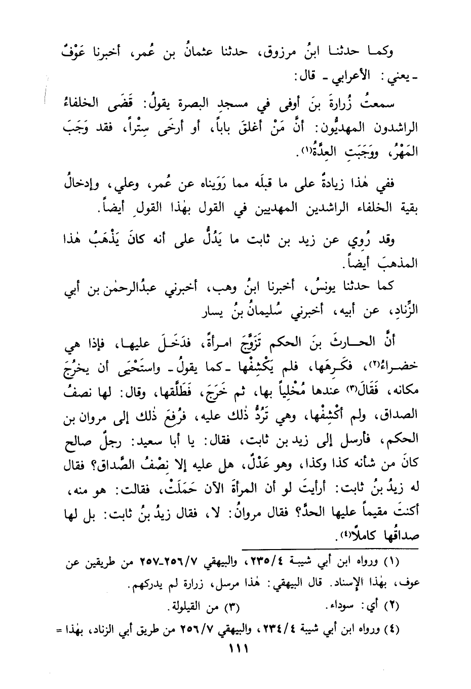 وَكَمَا حَدَّثَنَا ابْنُ مَرْزُوقٍ حَدَّثَنَا عُثْمَانُ بْنُ عُمَرَ أَخْبَرَنَا عَوْفٌ يَعْنِي الْأَعْرَابِيَّ قَالَ: سَمِعْتُ زُرَارَةَ بْنَ أَوْفَى فِي مَسْجِدِ الْبَصْرَةِ يَقُولُ: " قَضَى الْخُلَفَاءُ الرَّاشِدُونَ الْمَهْدِيُّونَ أَنَّ مَنْ أَغْلَقَ بَابًا أَوْ أَرْخَى سِتْرًا فَقَدْ وَجَبَ الْمَهْرُ، وَوَجَبَتِ الْعِدَّةُ " فَفِي هَذَا زِيَادَةٌ عَلَى مَا قَبْلَهُ مِمَّا رَوَيْنَاهُ عَنْ عُمَرَ، وَعَلِيٍّ وَإِدْخَالُ بَقِيَّةِ الْخُلَفَاءِ الرَّاشِدِينَ الْمَهْدِيِّينَ فِي الْقَوْلِ بِهَذَا الْقَوْلِ أَيْضًا وَقَدْ رُوِيَ عَنْ زَيْدِ بْنِ ثَابِتٍ مَا يَدُلُّ عَلَى أَنَّهُ كَانَ يَذْهَبُ هَذَا الْمَذْهَبَ أَيْضًا