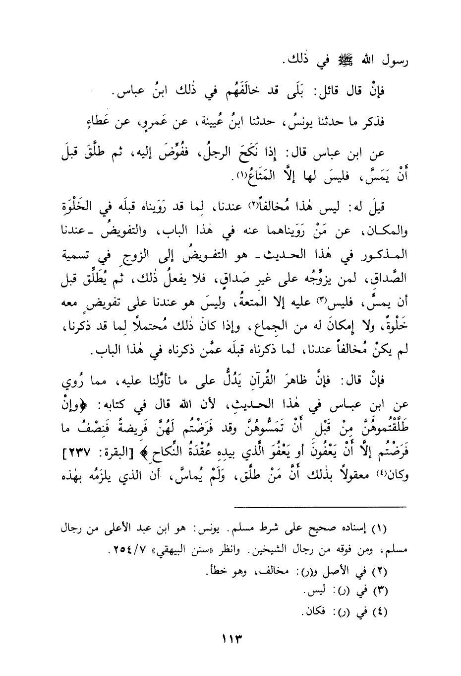فَذَكَرَ مَا حَدَّثَنَا يُونُسُ، حَدَّثَنَا ابْنُ عُيَيْنَةَ، عَنْ عَمْرٍو، عَنْ عَطَاءٍ، عَنِ ابْنِ عَبَّاسٍ قَالَ: " إذَا نَكَحَ الرَّجُلُ فَفُوِّضَ إلَيْهِ ثُمَّ طَلَّقَ قَبْلَ أَنْ يَمَسَّ فَلَيْسَ لَهَا إلَّا الْمَتَاعُ " قِيلَ لَهُ: لَيْسَ هَذَا مُخَالِفًا عِنْدَنَا لِمَا قَدْ رَوَيْنَاهُ قَبْلَهُ فِي الْخَلْوَةِ وَالْمَكَانِ عَنْ مَنْ رَوَيْنَاهُمَا عَنْهُ فِي هَذَا الْبَابِ، وَالتَّفْوِيضُ عِنْدَنَا الْمَذْكُورُ فِي هَذَا الْحَدِيثِ هُوَ التَّفْوِيضُ إلَى الزَّوْجِ فِي تَسْمِيَةِ الصَّدَاقِ لِمَنْ يُزَوِّجُهُ عَلَى غَيْرِ صَدَاقٍ فَلَا يَفْعَلُ ذَلِكَ ثُمَّ يُطَلِّقُ قَبْلَ أَنْ يَمَسَّ فَلَيْسَ عَلَيْهِ إلَّا الْمُتْعَةُ، وَلَيْسَ هُوَ عِنْدَنَا عَلَى تَفْوِيضٍ مَعَهُ خَلْوَةٌ، وَلَا إمْكَانَ لَهُ مِنَ الْجِمَاعِ وَإِذَا كَانَ ذَلِكَ مُحْتَمَلًا لِمَا قَدْ ذَكَرْنَا لَمْ يَكُنْ مُخَالِفًا عِنْدَنَا لِمَا ذَكَرْنَاهُ قَبْلَهُ عَمَّنْ ذَكَرْنَاهُ فِي هَذَا الْبَابِ فَإِنْ قَالَ: فَإِنَّ ظَاهِرَ الْقُرْآنِ يَدُلُّ عَلَى مَا تَأَوَّلْنَا عَلَيْهِ مِمَّا رُوِيَ عَنِ ابْنِ عَبَّاسٍ فِي هَذَا الْحَدِيثِ؛ لِأَنَّ اللهَ قَالَ فِي كِتَابِهِ: {وَإِنْ طَلَّقْتُمُوهُنَّ مِنْ قَبْلِ أَنْ تَمَسُّوهُنَّ وَقَدْ فَرَضْتُمْ لَهُنَّ فَرِيضَةً فَنِصْفُ مَا فَرَضْتُمْ إلَّا أَنْ يَعْفُونَ أَوْ يَعْفُوَ الَّذِي بِيَدِهِ عُقْدَةُ النِّكَاحِ} [البقرة: 237] ، وَكَانَ مَعْقُولًا بِذَلِكَ أَنَّ مَنْ طَلَّقَ وَلَمْ يُمَاسَّ أَنَّ الَّذِي يَلْزَمُهُ بِهَذِهِ -[114]- الْآيَةِ هُوَ نِصْفُ الصَّدَاقِ لَا كُلُّهُ، قِيلَ لَهُ: إنَّ الَّذِينَ قَالُوا فِي هَذَا بِوُجُوبِ الصَّدَاقِ وَوُجُوبِ الْعِدَّةِ هُمُ الْخُلَفَاءُ الرَّاشِدُونَ الْمَهْدِيُّونَ أَبُو بَكْرٍ، وَعُمَرُ، وَعُثْمَانُ، وَعَلِيُّ وَلَحِقَ بِهِمْ فِي ذَلِكَ زَيْدُ بْنُ ثَابِتٍ وَهُوَ كَاتِبُ الْوَحْيِ وَالْمُؤْتَمَنُ عَلَيْهِ، وَالْقُرْآنُ نَزَلَ بِلُغَتِهِمْ وَهُمْ يَعْرِفُونَ تَأْوِيلَهُ، وَكَانَ بِمَا أُشْكِلَ عَلَيْهِمْ مِنْهُ يَسْتَعْلِمُونَ رَسُولَ اللهِ صَلَّى اللَّهُ عَلَيْهِ وَسَلَّمَ فَيُعْلِمُهُمْ بِمُرَادِ اللهِ تَعَالَى بِهِ، وَفِي خِلَافِهِمْ تَجْهِيلٌ لَهُمْ وَالْخُرُوجُ عَنْ مَذَاهِبِهِمْ إلَى مَا سِوَاهَا مِمَّا نَعُوذُ بِاللهِ مِنْهُ مَعَ أَنَّا قَدْ وَجَدْنَا فِي اللُّغَةِ مَا قَدْ أَبَاحَ لَنَا أَنْ نُسَمِّيَ مَنْ أَمْكَنَهُ الْمَسِيسُ وَلَمْ يُمَاسَّ بِاسْمِ الْمَسِيسِ كَمَا سُمِّيَ ابْنُ إبْرَاهِيمَ عَلَيْهِمَا السَّلَامُ إمَّا إسْمَاعِيلُ، وَإِمَّا إِسْحَاقُ ذَبِيحًا؛ لَا لِأَنَّهُ ذُبِحَ وَلَكِنْ لَمَّا أَمْكَنَ مِنْ نَفْسِهِ، وَأُمْكِنَ أَبُوهُ ذَلِكَ مِنْهُ بِأَنْ تَلَّهُ لِلْجَبِينِ سُمِّيَ بِذَلِكَ ذَبِيحًا وَإِنْ لَمْ يُذْبَحْ، فَمِثْلُ ذَلِكَ مَا قَدْ ذَكَرْنَاهُ مِنْ إمْكَانِ هَذِهِ الْمَرْأَةِ نَفْسَهَا زَوْجَهَا مِنْ جِمَاعِهِ حَتَّى لَمْ يَكُنْ بَيْنَهُ وَبَيْنَ ذَلِكَ حَائِلٌ وَلَا لَهُ مِنْهُ مَانِعٌ يَجُوزُ أَنْ يُطْلَقَ عَلَيْهِ اسْمُ مُمَاسٍّ لَهَا وَإِنْ لَمْ يَكُنْ مُمَاسًّا لَهَا فِي الْحَقِيقَةِ، وَتَدْخُلُ بِذَلِكَ فِي مَعْنَى الْمُطَلَّقِ بَعْدَ الْمَسِيسِ؛ لِأَنَّهُ فِي مَعْنَى الْمُطَلَّقِ قَبْلَهُ، وَقَدْ وَجَدْنَا مَا قَدْ أَجْمَعَ الْمُسْلِمُونَ عَلَيْهِ؛ لِأَنَّهُمْ لَمْ يَخْتَلِفُوا فِي مَنْ بَاعَ شَيْئًا لَهُ بِثَمَنٍ حَبَسَهُ حَتَّى يَقْبِضَ ذَلِكَ الثَّمَنَ فَمُكِّنَ مِنْ قَبْضِهِ، وَخُلِّيَ بَيْنَهُ وَبَيْنَهُ فَلَمْ يَضَعْ يَدَهُ عَلَيْهِ، وَلَمْ يَقْبِضْهُ وَلَحِقَهُ -[115]- هَلَاكٌ أَنَّهُ يَكُونَ هَالِكًا مِنْ مَالِهِ لَا مِنْ مَالِ بَائِعِهِ وَفِي ذَلِكَ عَ