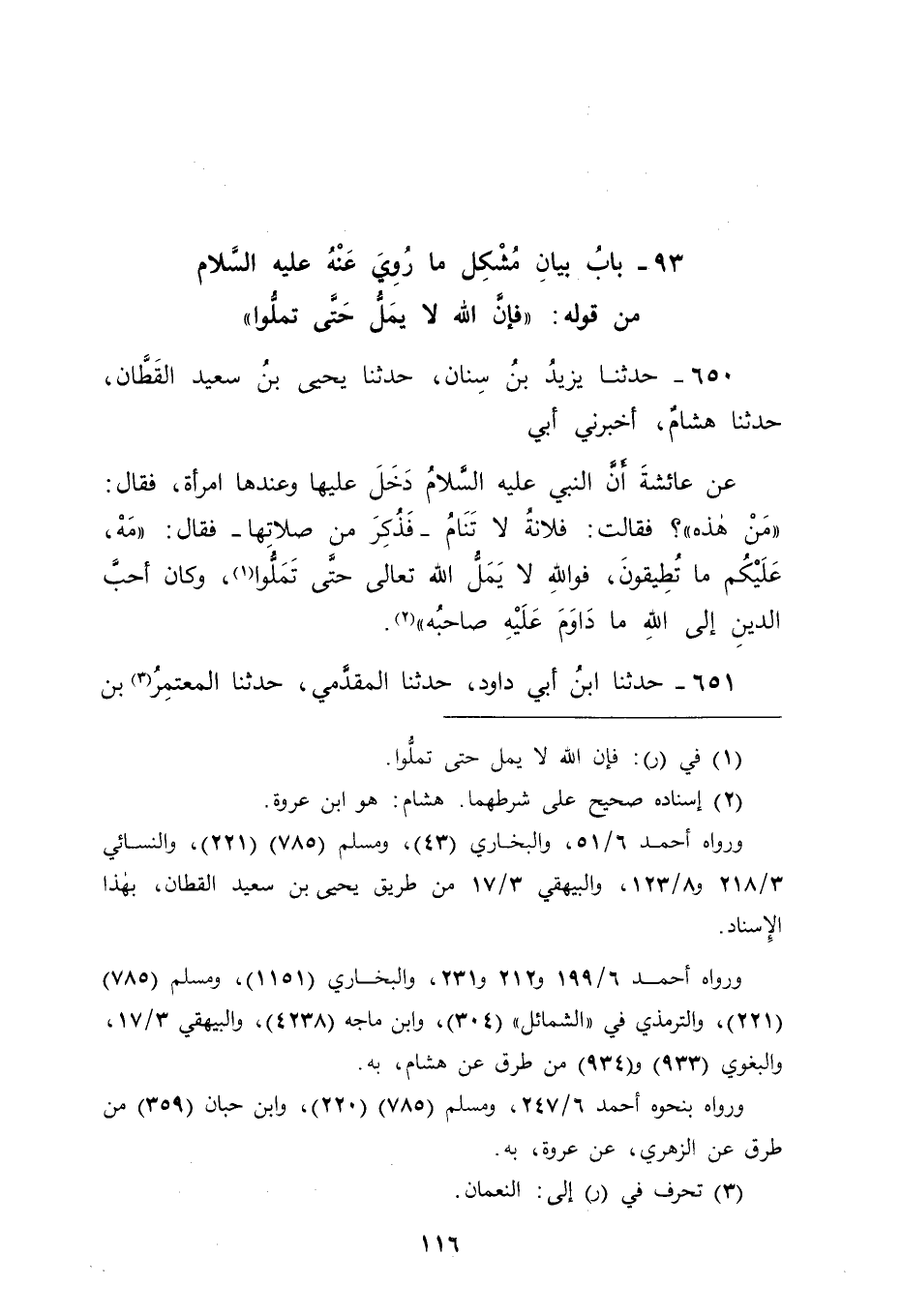 650 - حَدَّثَنَا يَزِيدُ بْنُ سِنَانٍ، حَدَّثَنَا يَحْيَى بْنُ سَعِيدٍ الْقَطَّانُ، حَدَّثَنَا هِشَامٌ، أَخْبَرَنِي أَبِي، عَنْ عَائِشَةَ أَنَّ النَّبِيَّ عَلَيْهِ السَّلَامُ دَخَلَ عَلَيْهَا وَعِنْدَهَا امْرَأَةٌ، فَقَالَ: " مَنْ هَذِهِ " فَقَالَتْ: فُلَانَةُ لَا تَنَامُ، فَذُكِرَ مِنْ صَلَاتِهَا، فَقَالَ: " مَهْ عَلَيْكُمْ مَا تُطِيقُونَ فَوَاللهِ لَا يَمَلُّ اللهُ تَعَالَى حَتَّى تَمَلُّوا، وَكَانَ أَحَبُّ الدِّينِ إلَى اللهِ مَا دَاوَمَ عَلَيْهِ صَاحِبُهُ "