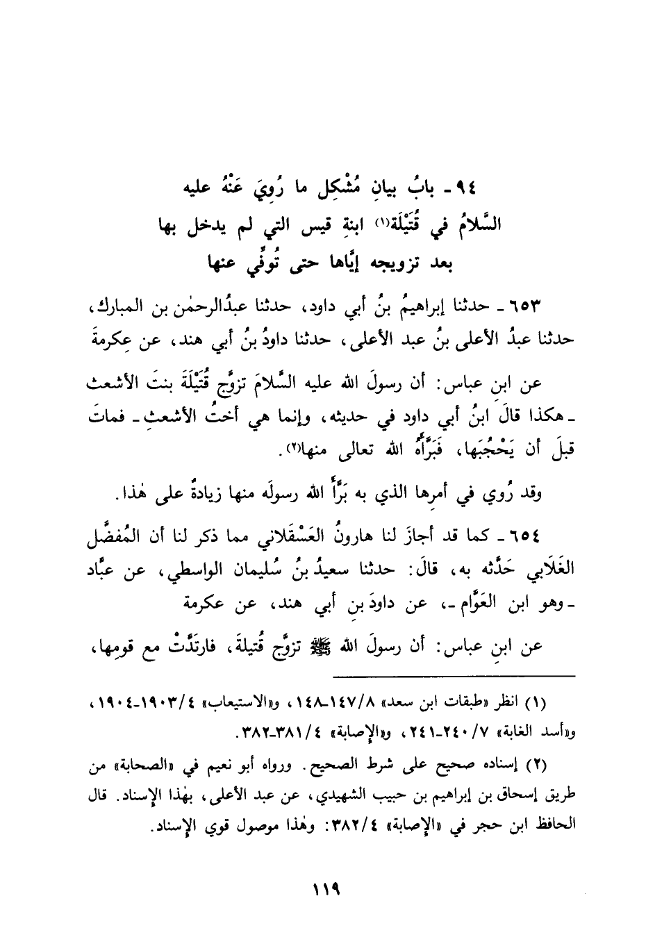 653 - حَدَّثَنَا إبْرَاهِيمُ بْنُ أَبِي دَاوُدَ، حَدَّثَنَا عَبْدُ الرَّحْمَنِ بْنُ الْمُبَارَكِ، حَدَّثَنَا عَبْدُ الْأَعْلَى بْنُ عَبْدِ الْأَعْلَى، حَدَّثَنَا دَاوُدُ بْنُ أَبِي هِنْدَ، عَنْ عِكْرِمَةَ، عَنِ ابْنِ عَبَّاسٍ " أَنَّ رَسُولَ اللهِ عَلَيْهِ السَّلَامُ تَزَوَّجَ قُتَيْلَةَ بِنْتَ الْأَشْعَثِ هَكَذَا قَالَ ابْنُ أَبِي دَاوُدَ فِي حَدِيثِهِ وَإِنَّمَا هِيَ أُخْتُ الْأَشْعَثِ، فَمَاتَ قَبْلَ أَنْ يَحْجُبَهَا فَبَرَّأَهُ اللهُ تَعَالَى مِنْهَا " وَقَدْ رُوِيَ فِي أَمْرِهَا الَّذِي بِهِ بَرَّأَ اللهُ رَسُولَهُ مِنْهَا زِيَادَةٌ عَلَى هَذَا