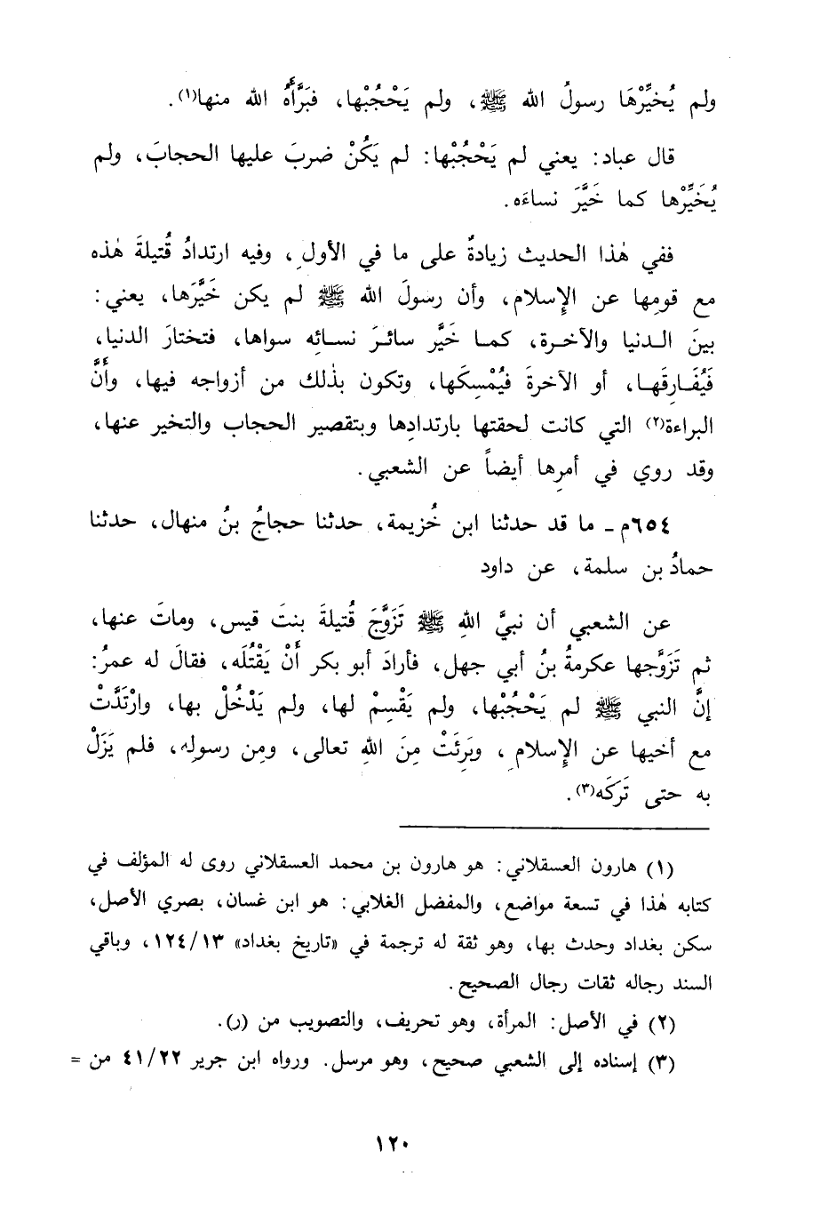 654 م - مَا قَدْ حَدَّثَنَا ابْنُ خُزَيْمَةَ، حَدَّثَنَا حَجَّاجُ بْنُ مِنْهَالٍ، حَدَّثَنَا حَمَّادُ بْنُ سَلَمَةَ، عَنْ دَاوُدَ، عَنِ الشَّعْبِيِّ: " أَنَّ نَبِيَّ اللهِ صَلَّى اللَّهُ عَلَيْهِ وَسَلَّمَ تَزَوَّجَ قُتَيْلَةَ بِنْتَ قَيْسٍ وَمَاتَ عَنْهَا ثُمَّ تَزَوَّجَهَا عِكْرِمَةُ بْنُ أَبِي جَهْلٍ فَأَرَادَ أَبُو بَكْرٍ أَنْ يَقْتُلَهُ، فَقَالَ لَهُ عُمَرُ: إنَّ النَّبِيَّ صَلَّى اللَّهُ عَلَيْهِ وَسَلَّمَ لَمْ يَحْجُبَهَا، وَلَمْ يَقْسِمْ لَهَا، وَلَمْ يَدْخُلْ بِهَا وَارْتَدَّتْ مَعَ أَخِيهَا عَنَ الْإِسْلَامِ وَبَرِئَتْ مِنَ اللهِ تَعَالَى، وَمِنْ رَسُولِهِ فَلَمْ يَزَلْ بِهِ حَتَّى تَرَكَهُ " -[121]- فَفِي هَذَا الْحَدِيثِ أَنَّ أَبَا بَكْرٍ أَرَادَ أَنْ يَقْتُلَ عِكْرِمَةَ لَمَّا تَزَوَّجَ هَذِهِ الْمَرْأَةَ؛ لِأَنَّهَا كَانَتْ عِنْدَهُ مِنْ أَزْوَاجِ النَّبِيِّ صَلَّى اللَّهُ عَلَيْهِ وَسَلَّمَ اللَّاتِي كُنَّ حُرِّمْنَ عَلَى النَّاسِ بِقَوْلِ اللهِ تَعَالَى: {وَمَا كَانَ لَكُمْ أَنْ تُؤْذُوا رَسُولَ اللهِ} [الأحزاب: 53] الْآيَةَ، وَأَنَّ عُمَرَ أَخْرَجَهَا مِنْ أَزْوَاجِ رَسُولِ اللهِ صَلَّى اللَّهُ عَلَيْهِ وَسَلَّمَ بِرِدَّتِهَا الَّتِي كَانَتْ مِنْهَا إذْ كَانَ لَا يَصْلُحُ لَهَا مَعَهَا أَنْ تَكُونَ لِلْمُسْلِمِينَ أُمًّا، وَقَدْ رُوِيَ عَنْ حُذَيْفَةَ بْنِ الْيَمَانِ فِي السَّبَبِ الَّذِي بِهِ حُرِّمَ عَلَى أَزْوَاجِ رَسُولِ اللهِ صَلَّى اللَّهُ عَلَيْهِ وَسَلَّمَ أَنْ يَتَزَوَّجْنَ بَعْدَهُ