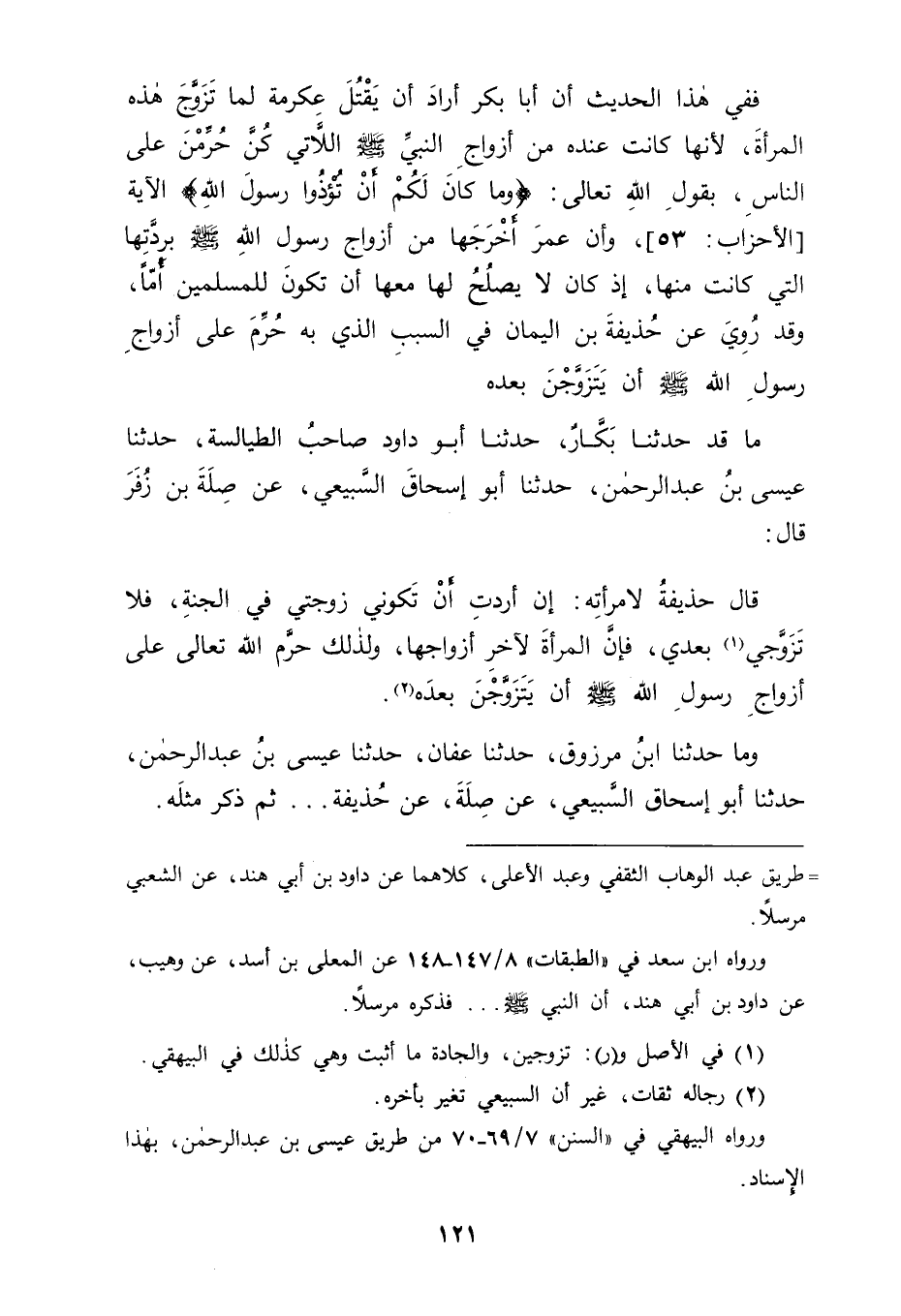 مَا قَدْ حَدَّثَنَا بَكَّارٌ حَدَّثَنَا أَبُو دَاوُدَ صَاحِبُ الطَّيَالِسَةِ حَدَّثَنَا عِيسَى بْنُ عَبْدِ الرَّحْمَنِ حَدَّثَنَا أَبُو إِسْحَاقَ السَّبِيعِيُّ عَنْ صِلَةَ بْنِ زُفَرَ قَالَ: قَالَ حُذَيْفَةُ لِامْرَأَتِهِ " إنْ أَرَدْتِ أَنْ تَكُونِي زَوْجَتِي فِي الْجَنَّةِ فَلَا تَزَوَّجِي بَعْدِي فَإِنَّ الْمَرْأَةَ لِآخِرِ أَزْوَاجِهَا، وَلِذَلِكَ حَرَّمَ اللهُ تَعَالَى عَلَى أَزْوَاجِ رَسُولِ اللهِ صَلَّى اللَّهُ عَلَيْهِ وَسَلَّمَ أَنْ يَتَزَوَّجْنَ بَعْدَهُ " وَمَا حَدَّثَنَا ابْنُ مَرْزُوقٍ، حَدَّثَنَا عَفَّانُ، حَدَّثَنَا عِيسَى بْنُ عَبْدِ الرَّحْمَنِ، حَدَّثَنَا أَبُو إِسْحَاقَ السَّبِيعِيُّ، عَنْ صِلَةَ، عَنْ حُذَيْفَةَ، ثُمَّ ذَكَرَ مِثْلَهُ