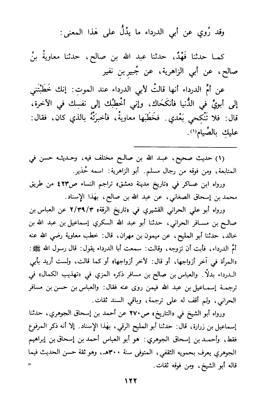 وَقَدْ رُوِيَ عَنْ أَبِي الدَّرْدَاءِ مَا يَدُلُّ عَلَى هَذَا الْمَعْنَى كَمَا حَدَّثَنَا فَهْدٌ، حَدَّثَنَا عَبْدُ اللهِ بْنُ صَالِحٍ، حَدَّثَنَا مُعَاوِيَةُ بْنُ صَالِحٍ، عَنْ أَبِي الزَّاهِرِيَّةِ، عَنْ جُبَيْرِ بْنِ نُفَيْرٍ، عَنْ أُمِّ الدَّرْدَاءِ أَنَّهَا قَالَتْ لِأَبِي الدَّرْدَاءِ عِنْدَ الْمَوْتِ: " إنَّكَ خَطَبْتَنِي إلَى أَبَوَيَّ فِي الدُّنْيَا فَأَنْكَحَاكَ وَإِنِّي أَخْطُبُكَ إلَى نَفْسِكَ فِي الْآخِرَةِ "، قَالَ " فَلَا تَنْكِحِي بَعْدِي " فَخَطَبَهَا مُعَاوِيَةُ فَأَخْبَرَتْهُ بِالَّذِي كَانَ فَقَالَ: " عَلَيْكِ بِالصِّيَامِ " -[123]- مَعَ أَنَّهُ قَدْ رُوِيَ عَنْ عُمَرَ أَنَّهُ كَانَ مَنَعَ قُتَيْلَةَ هَذِهِ مِنَ التَّزْوِيجِ، وَإِنْ كَانَ قَدْ أَخْرَجَهَا مِنْ أَزْوَاجِ النَّبِيِّ عَلَيْهِ السَّلَامُ بِمَا أَخْرَجَهَا بِهِ مِمَّا ذَكَرْنَاهُ عَنْهُ
