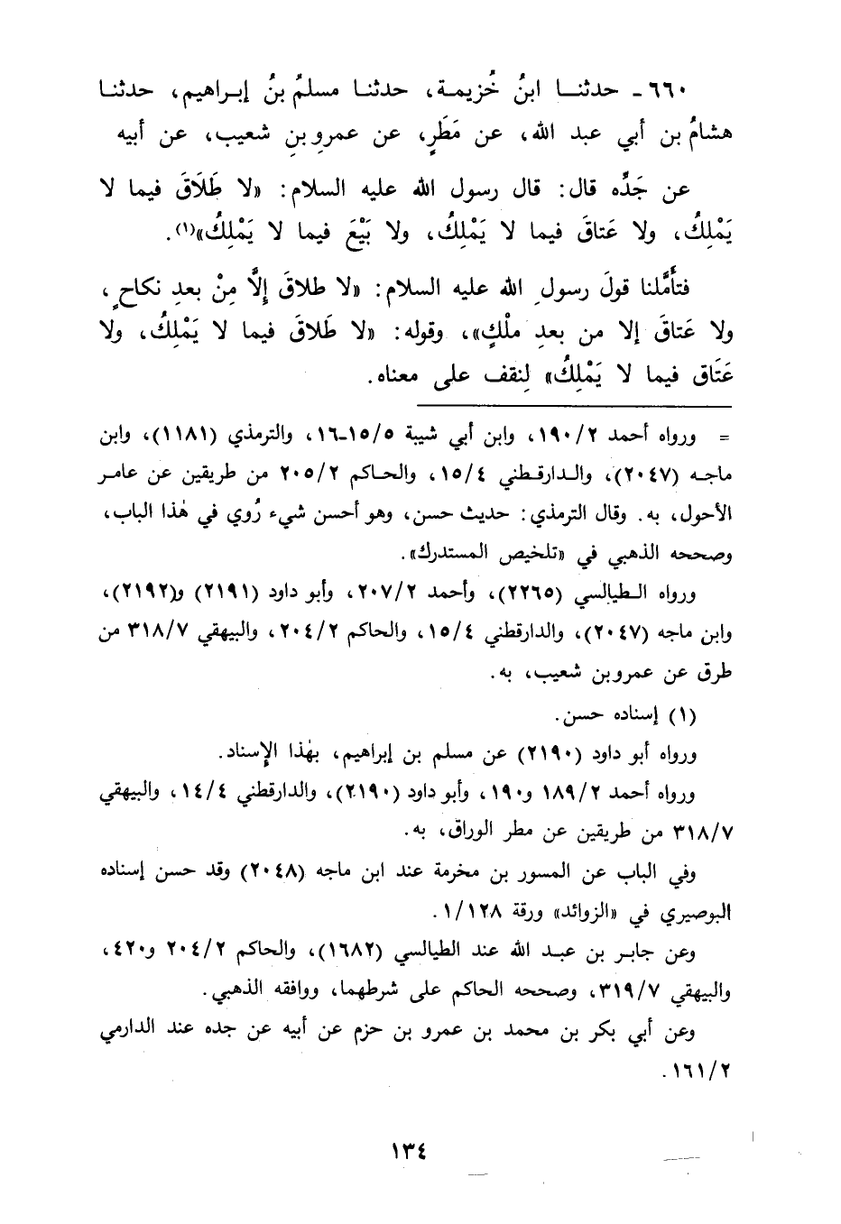 660 - حَدَّثَنَا ابْنُ خُزَيْمَةَ، حَدَّثَنَا مُسْلِمُ بْنُ إبْرَاهِيمَ، حَدَّثَنَا هِشَامُ بْنُ أَبِي عَبْدِ اللهِ، عَنْ مَطَرٍ، عَنْ عَمْرِو بْنِ شُعَيْبٍ، عَنْ أَبِيهِ، عَنْ جَدِّهِ قَالَ: قَالَ رَسُولُ اللهِ عَلَيْهِ السَّلَامُ: " لَا طَلَاقَ فِيمَا لَا يَمْلِكُ، وَلَا عَتَاقَ فِيمَا لَا يَمْلِكُ، وَلَا بَيْعَ فِيمَا لَا يَمْلِكُ " فَتَأَمَّلْنَا قَوْلَ رَسُولِ اللهِ عَلَيْهِ السَّلَامُ: " لَا طَلَاقَ إلَّا مِنْ بَعْدِ نِكَاحٍ، وَلَا عَتَاقَ إلَّا مِنْ بَعْدِ مِلْكٍ " وَقَوْلَهُ: " لَا طَلَاقَ فِيمَا لَا يَمْلِكُ، وَلَا عَتَاقَ فِيمَا لَا يَمْلِكُ "؛ لِنَقِفَ عَلَى مَعْنَاهُ
