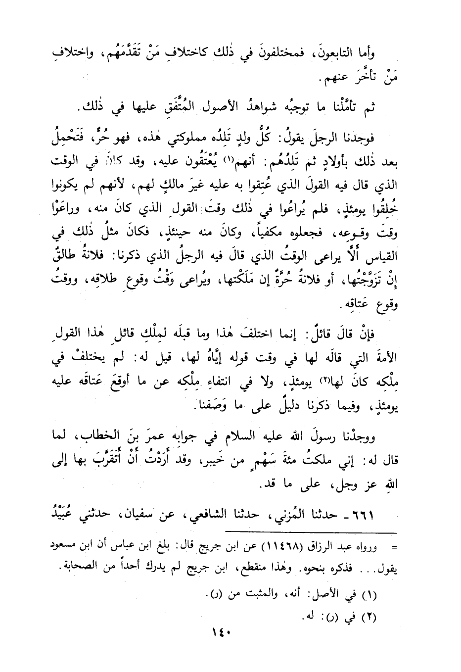 662 - وَوَجَدْنَا أَحْمَدَ بْنَ شُعَيْبِ بْنِ عَلِيٍّ النَّسَائِيَّ قَدْ حَدَّثَنَا قَالَ: حَدَّثَنَا سَعِيدُ بْنُ عَبْدِ الرَّحْمَنِ، حَدَّثَنَا سُفْيَانُ، عَنْ عَبْدِ اللهِ بْنِ عُمَرَ، عَنْ نَافِعٍ، عَنِ ابْنِ عُمَرَ، ثُمَّ ذَكَرَ مِثْلَهُ سَوَاءً -[142]- فَكَانَ فِي أَمْرِ رَسُولِ اللهِ صَلَّى اللَّهُ عَلَيْهِ وَسَلَّمَ عُمَرَ جَوَابٌ لِمَسْأَلَتِهِ إيَّاهُ بِتَحْبِيسِ أَصْلِ سِهَامِهِ هَذِهِ وَتَسْبِيلِ ثَمَرَتِهَا الْحَادِثَةِ فِيهَا مَا قَدْ دَلَّ عَلَى جَوَازِ الْعُقُودِ فِي الْأَشْيَاءِ الْحَوَادِثِ عَنْهَا مِمَّا لَمْ يَكُنْ عَاقَدُوهَا فِي وَقْتِ عَقْدِهِمْ مَا عَقَدُوا فِيهَا مَالِكِينَ لَهَا فَمِثْلُ ذَلِكَ أَيْضًا مَا يَعْقِدُهُ الرَّجُلُ عَلَى مَا يَمْلِكُهُ فِي الْمُسْتَأْنَفِ مِنْ مَمَالِيكَ مِنْ عَتَاقٍ وَعَلَى مَا يَتَزَوَّجُهُ مِنَ النِّسَاءِ مِنْ طَلَاقٍ حُكْمُهُ كَحُكْمِ مَا يَحْدُثُ عَنَ الْأَشْيَاءِ الْمُسَبَّلَةِ فَيَجْرِي ذَلِكَ الْعَتَاقُ وَذَلِكَ الطَّلَاقُ فِيمَا عَقَدَا عَلَيْهِ كَمَا جَرَتِ الْوُجُوهُ الَّتِي عُقِدَتْ عَلَى الثَّمَرَةِ الْحَادِثَةِ بَعْدَ التَّسْبِيلِ فِي الْأَشْيَاءِ الْمُسَبَّلَةِ وَمِثْلُ ذَلِكَ أَيْضًا مَا قَدْ أَجْمَعُوا عَلَى إجَازَتِهِ فِي الْوَكَالِاتِ فِيمَنْ تَجِبُ عَلَيْهِ رَقَبَةٌ فِي ظِهَارٍ، أَوْ كَفَّارَةِ يَمِينٍ فَيُوَكِّلُ رَجُلًا بِابْتِيَاعِهَا، وَعَتَاقِهَا عَنْهُ عَنْ ذَلِكَ، فَفَعَلَ الْوَكِيلُ مَا أَمَرَهُ بِهِ مِنْ ذَلِكَ أَنَّ ذَلِكَ جَازَ عَنْهُ مِنَ الرَّقَبَةِ الَّتِي كَانَتْ عَلَيْهِ، وَقَدْ كَانَتِ الْوَكَالَةُ مِنْهُ فِيهَا قَبْلَ أَنْ يَمْلِكَهَا فَلَمْ يَضُرَّهُ ذَلِكَ وَرُوعِيَ وَقْتُ وُقُوعِ عَتَاقِهِ عَلَيْهَا، وَلَمْ يُرَاعَ تَوْكِيلُهُ بِذَلِكَ قَبْلَ مِلْكِهِ إيَّاهَا. وَمِنْ ذَلِكَ مَا قَدْ أَجْمَعُوا عَلَيْهِ فِي الْوَصَايَا فَجَوَّزُوا لِلرَّجُلِ أَنْ يُوَصِّيَ بِثُلُثِ مَالِهِ فِيمَا يُوَصِّيَ بِهِ فَيَكُونُ ذَلِكَ عَامِلًا فِيمَا كَانَ مَالِكًا لَهُ يَوْمَ أَوْصَى مِمَّا يَبْقَى فِي مِلْكِهِ إلَى أَنْ يَمُوتَ، وَفِيمَا يُفِيدُهُ بَعْدَ ذَلِكَ إلَى أَنْ يَمُوتَ مِمَّا يَبْقَى فِي مِلْكِهِ إلَى أَنْ يَمُوتَ، وَلَمْ يُرَاعَ -[143]- فِي ذَلِكَ مِلْكُهُ يَوْمَ أَوْصَى فَيَجُوزُ فِيهِ وَصَايَاهُ وَلَا عَدَمُهُ، فَيَبْطُلُ بِهِ وَصَايَاهُ، وَرُوعِيَ بَقَاءُ مِلْكِهِ حِينَ يَمُوتُ عَلَى الْأَشْيَاءِ الَّتِي يَمُوتُ عَنْهَا وَهُوَ مَالِكٌ لَهَا، فَأُعْلِمَتْ وَصَايَاهُ فِيهَا حِينَئِذٍ؛ لِوُقُوعِهَا فِيمَا كَانَ مِلْكًا لَهُ يَوْمَ وَجَبَتْ، فَمِثْلُ ذَلِكَ عُقُودُ الْأَيْمَانِ الَّتِي ذَكَرْنَا مِنَ الْعَتَاقِ، وَمِنَ الطَّلَاقِ لَا يُرَاعَى مِلْكُ عَاقِدِيهَا لَهَا يَوْمَ عَقَدُوا تِلْكَ الْأَيْمَانَ عَلَيْهَا وَيُرَاعَى مِلْكُهُمْ لَهَا عِنْدَ وُقُوعِهَا عَلَيْهَا ثُمَّ تَأَمَّلْنَا هَذَا الْبَابَ أَيْضًا فَوَجَدْنَا رَسُولَ اللهِ صَلَّى اللَّهُ عَلَيْهِ وَسَلَّمَ قَدْ قَالَ: " لَا نَذْرَ لِابْنِ آدَمَ فِيمَا لَا يَمْلِكُ " وَسَنَذْكُرُ ذَلِكَ فِيمَا بَعْدُ مِنْ كِتَابِنَا هَذَا إنْ شَاءَ اللهُ كَمَا قَالَ: " لَا طَلَاقَ إلَّا بَعْدَ نِكَاحٍ " ثُمَّ وَجَدْنَا اللهَ تَعَالَى قَدْ قَالَ فِي كِتَابِهِ: {وَمِنْهُمْ مَنْ عَاهَدَ اللهَ لَئِنْ آتَانَا مِنْ فَضْلِهِ} [التوبة: 75] إلَى قَوْلِهِ: {وَبِمَا كَانُوا يَكْذِبُونَ} [التوبة: 77] فَكَانَ مَا كَانَ مِنْهُمْ بِقَوْلِهِمْ: {لَئِنْ آتَانَا مِنْ فَضْلِهِ، لَنَصَّدَّقَنَّ وَلَنَكُونَنَّ مِنَ الصَّالِحِينَ} [التوبة: 75] مِمَّا قَدْ أَوْجَبَهُ عَلَيْهِمْ إذَا آتَاهُمْ مَا وَعَدُوهُ أَنْ يَفْعَلُوهُ فِيهِ إذَا آتَاهُمْ إيَّاهُ، وَكَانَ ذَلِكَ
