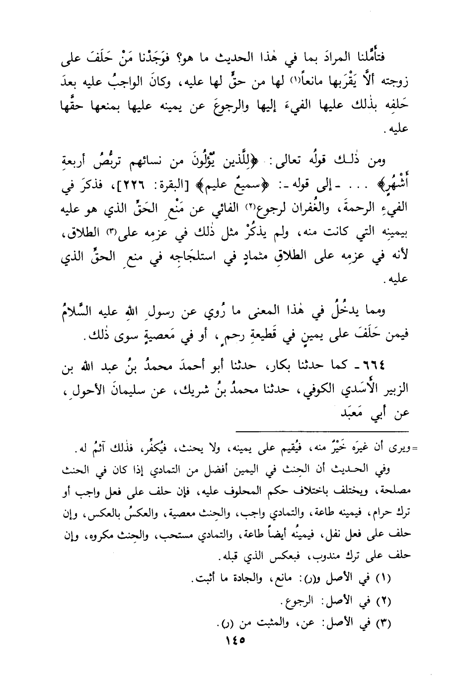 664 - كَمَا حَدَّثَنَا بَكَّارٌ، حَدَّثَنَا أَبُو أَحْمَدَ مُحَمَّدُ بْنُ عَبْدِ اللهِ بْنِ الزُّبَيْرِ الْأَسَدِيُّ الْكُوفِيُّ، حَدَّثَنَا مُحَمَّدُ بْنُ شَرِيكٍ، عَنْ سُلَيْمَانَ الْأَحْوَلِ، عَنْ أَبِي مَعْبَدٍ، -[146]- عَنِ ابْنِ عَبَّاسٍ رَفَعَهُ قَالَ: " مَنْ حَلَفَ عَلَى يَمِينِ قَطِيعَةٍ أَوْ مَعْصِيَةٍ فَحَنِثَ فَذَلِكَ كَفَّارَةٌ " قَالَ أَبُو جَعْفَرٍ: أَيْ لِأَنَّ حِنْثَهُ فِيهَا رُجُوعٌ عَمَّا كَانَ حَلَفَ بِهَا عَلَيْهِ فَرُجُوعُهُ عَنْ ذَلِكَ كَفَّارَةٌ لَهُ. فَمِثْلُ ذَلِكَ أَيْضًا مَا رَوَيْنَاهُ مِنْ حَدِيثِ أَبِي هُرَيْرَةَ هُوَ أَيْضًا مِنْ هَذَا الْجِنْسِ؛ لِأَنَّ الْحَالِفَ عَلَى أَهْلِهِ يَمْنَعُهَا حَقَّهَا الَّذِي لَهَا عَلَيْهِ عَاصٍ لِرَبِّهِ تَعَالَى وَكَفَّارَتُهُ مِنْ تِلْكَ الْمَعْصِيَةِ رُجُوعُهُ عَنْهَا. فَإِنْ قَالَ قَائِلٌ: فَلَيْسَ فِي الْحَدِيثِ رُجُوعُهُ وَلَا فَيْئَهُ. فَكَانَ جَوَابُنَا لَهُ فِي ذَلِكَ أَنَّ ذَلِكَ الْخِطَابَ الَّذِي كَانَ مِنْ رَسُولِ اللهِ صَلَّى اللَّهُ عَلَيْهِ وَسَلَّمَ لِلنَّاسِ خِطَابٌ عَرَبِيٌّ خَاطَبَ بِهِ قَوْمًا عُرْبًا، فَكَانَ فِيمَا -[147]- خَاطَبَهُمْ بِهِ مِنْ ذَلِكَ مَا قَدْ فَهِمُوا بِهِ عَنْهُ مُرَادَهُ، وَهُوَ الَّذِي ذَكَرْنَاهُ فَأَغْنَاهُ ذَلِكَ عَنْ كَشْفِهِ إيَّاهُ لَهُمْ بِلِسَانِهِ كَمِثْلِ مَا قَدْ جَاءَ الْقُرْآنُ بِقَوْلِهِ فِي سُورَةِ النُّورِ: {وَلَوْلَا فَضْلُ اللهِ عَلَيْكُمْ، وَرَحْمَتُهُ وَأَنَّ اللهَ تَوَّابٌ حَكِيمٌ} [النور: 10] وَاكْتَفَى بِذَلِكَ عَمَّا كَانَ يَكُونُ لَوْلَا فَضْلُهُ عَلَيْكُمْ وَرَحْمَتُهُ إيَّاهُمْ، وَكَمِثْلِ قَوْلِهِ فِي سُورَةِ الرَّعْدِ: {وَلَوْ أَنَّ قُرْآنًا سُيِّرَتْ بِهِ الْجِبَالُ، أَوْ قُطِّعَتْ بِهِ الْأَرْضُ، أَوْ كُلِّمَ بِهِ الْمَوْتَى بَلْ لِلَّهِ الْأَمْرُ جَمِيعًا} [الرعد: 31] مِنْ غَيْرِ ذِكْرِهِ لِمَا كَانَ يَكُونُ لَوْ كَانَ مِنْ أَنْ يَفْعَلَ ذَلِكَ لِفَهْمِ الْمُخَاطَبِينَ بِذَلِكَ لِمَا قَدْ أَرَادَ أَنْ يَفْهَمُوهُ عَنْهُ بِذَلِكَ الْخِطَابِ الَّذِي خَاطَبَهُمْ بِهِ، فَمِثْلُ ذَلِكَ مِنْ حَدِيثِ أَبِي هُرَيْرَةَ: " مَنِ اسْتَلْجَجَ بِيَمِينٍ عَلَى أَهْلِهِ فَهُوَ أَعْظَمُ إثْمًا " أَيْ: مِمَّنْ سِوَاهُ مِنَ الْحَالِفِينَ بِغَيْرِ تِلْكَ الْيَمِينِ، فَاكْتَفَى عَلَيْهِ السَّلَامُ بِعِلْمِهِ أَنَّهُمْ قَدْ فَهِمُوا ذَلِكَ عَنْهُ بِزِيَادَةِ أَلْفَاظٍ فِيهَا كَشْفُ مَا أَرَادَهُ مِنْهُمْ مِمَّا خَاطَبَهُمْ مِنْ أَجْلِهِ بِمَا فِي ذَلِكَ الْحَدِيثِ