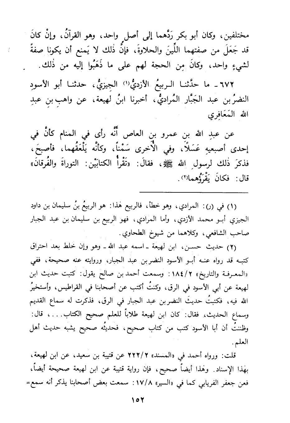 672 - مَا حَدَّثَنَا الرَّبِيعُ الْأَزْدِيُّ الْجِيزِيُّ، حَدَّثَنَا أَبُو الْأَسْوَدِ النَّضْرُ بْنُ عَبْدِ الْجَبَّارِ الْمُرَادِيُّ، أَخْبَرَنَا ابْنُ لَهِيعَةَ، عَنْ وَاهِبِ بْنِ عَبْدِ اللهِ الْمَعَافِرِيِّ، عَنْ عَبْدِ اللهِ بْنِ عَمْرِو بْنِ الْعَاصِ أَنَّهُ رَأَى فِي الْمَنَامِ كَأَنَّ فِي إحْدَى أُصْبُعَيْهِ عَسَلًا وَفِي الْأُخْرَى سَمْنًا وَكَأَنَّهُ يَلْعَقُهُمَا فَأَصْبَحَ، فَذَكَرَ ذَلِكَ لِرَسُولِ اللهِ صَلَّى اللَّهُ عَلَيْهِ وَسَلَّمَ، فَقَالَ: " تَقْرَأُ الْكِتَابَيْنِ: التَّوْرَاةَ، وَالْفُرْقَانَ " قَالَ: فَكَانَ يَقْرَؤُهُمَا. -[153]- فَكَانَ فِي هَذَا الْحَدِيثِ مِنْ عِبَارَةِ رَسُولِ اللهِ صَلَّى اللَّهُ عَلَيْهِ وَسَلَّمَ رُؤْيَا عَبْدِ اللهِ بْنِ عَمْرٍو الْمَذْكُورَةَ فِيهِ فِي السَّمْنِ وَالْعَسَلِ أَنَّهُمَا لِشَيْئَيْنِ مُخْتَلِفَيْنِ مِنْ أَصْلَيْنِ مُخْتَلِفَيْنِ، وَكَانَتْ عِبَارَةُ أَبِي بَكْرٍ فِي حَدِيثِ الظُّلَّةِ أَنَّهُمَا شَيْءٌ وَاحِدٌ مِنْ أَصْلٍ وَاحِدٍ، فَكَانَ الْخَطَأُ الَّذِي فِي ذِكْرِ الْعِبَارَةِ عِنْدَهُمْ هُوَ هَذَا، وَكَانَ الصَّوَابُ فِيهِ مَا كَانَ مِنْ رَسُولِ اللهِ صَلَّى اللَّهُ عَلَيْهِ وَسَلَّمَ فِي عِبَارَتِهِ رُؤْيَا عَبْدِ اللهِ بْنِ عَمْرٍو الْمَذْكُورَةَ فِي هَذَا الْحَدِيثِ، وَاللهَ نَسْأَلُهُ التَّوْفِيقَ