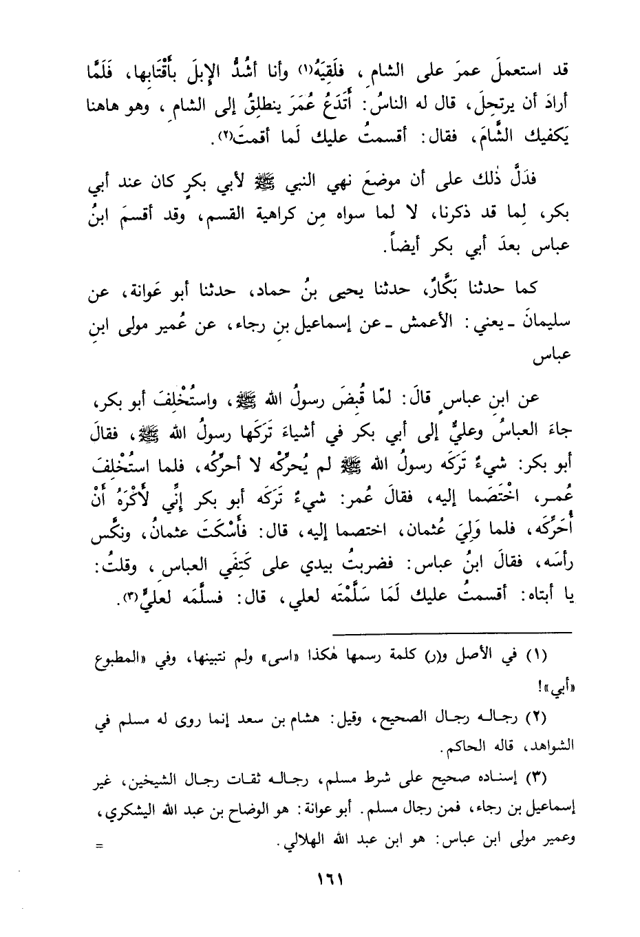 كَمَا حَدَّثَنَا بَكَّارٌ حَدَّثَنَا يَحْيَى بْنُ حَمَّادٍ حَدَّثَنَا أَبُو عَوَانَةَ، عَنْ سُلَيْمَانَ يَعْنِي الْأَعْمَشَ، عَنْ إسْمَاعِيلَ بْنِ رَجَاءٍ، عَنْ عُمَيْرٍ مَوْلَى ابْنِ عَبَّاسٍ، عَنِ ابْنِ عَبَّاسٍ قَالَ: " لَمَّا قُبِضَ رَسُولُ اللهِ صَلَّى اللَّهُ عَلَيْهِ وَسَلَّمَ، وَاسْتُخْلِفَ أَبُو بَكْرٍ جَاءَ الْعَبَّاسُ وَعَلِيٌّ إلَى أَبِي بَكْرٍ فِي أَشْيَاءَ تَرَكَهَا رَسُولُ اللهِ صَلَّى اللَّهُ عَلَيْهِ وَسَلَّمَ فَقَالَ أَبُو بَكْرٍ: شَيْءٌ تَرَكَهُ رَسُولُ اللهِ صَلَّى اللَّهُ عَلَيْهِ وَسَلَّمَ، لَمْ يُحَرِّكْهُ لَا أُحَرِّكُهُ فَلَمَّا اسْتُخْلِفَ عُمَرُ اخْتَصَمَا، إلَيْهِ فَقَالَ عُمَرُ: شَيْءٌ تَرَكَهُ أَبُو بَكْرٍ إنِّي لَأَكْرَهُ أَنْ أُحَرِّكَهُ، فَلَمَّا وُلِّيَ عُثْمَانُ اخْتَصَمَا إلَيْهِ قَالَ: فَسَكَتَ عُثْمَانُ وَنَكَّسَ رَأْسَهُ، فَقَالَ ابْنُ عَبَّاسٍ فَضَرَبْتُ بِيَدِي عَلَى كَتِفَيِ الْعَبَّاسِ وَقُلْتُ: يَا أَبَتَاهُ أَقْسَمْتُ عَلَيْكَ لَمَا سَلَّمْتَهُ لِعَلِيٍّ قَالَ: فَسَلَّمَهُ لِعَلِيٍّ " -[162]- فَدَلَّ ذَلِكَ عَلَى أَنَّ مَعْنَى مَا كَانَ مِنْ رَسُولِ اللهِ صَلَّى اللَّهُ عَلَيْهِ وَسَلَّمَ فِي ذَلِكَ الْحَدِيثِ مِنْ قَوْلِهِ لِأَبِي بَكْرٍ رَضِيَ اللهُ عَنْهُ: " لَا تُقْسِمْ " لَمْ يَكُنْ مَعْنَاهُ عِنْدَ ابْنِ عَبَّاسٍ أَيْضًا عَلَى كَرَاهِيَةِ الْقَسَمِ، وَلَكِنْ لِلْمَعْنَى الَّذِي ذَكَرْنَا، وَاللهَ تَعَالَى نَسْأَلُهُ التَّوْفِيقَ
