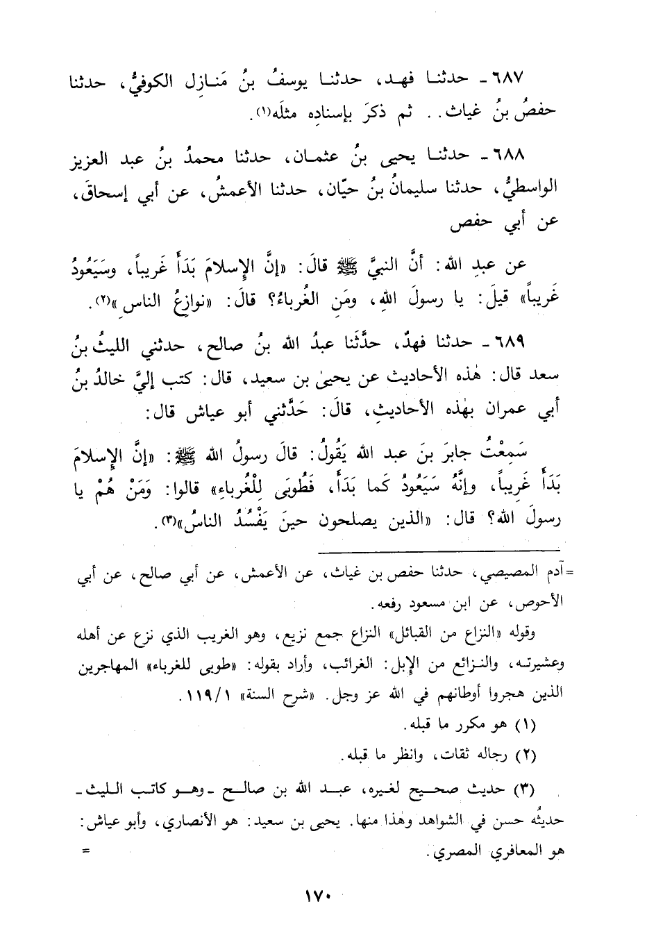688 - حَدَّثَنَا يَحْيَى بْنُ عُثْمَانَ، حَدَّثَنَا مُحَمَّدُ بْنُ عَبْدِ الْعَزِيزِ الْوَاسِطِيُّ، حَدَّثَنَا سُلَيْمَانُ بْنُ حَيَّانَ، حَدَّثَنَا الْأَعْمَشُ، عَنْ أَبِي إِسْحَاقَ، عَنْ أَبِي الْأَحْوَصٍ، عَنْ عَبْدِ اللهِ أَنَّ النَّبِيَّ صَلَّى اللَّهُ عَلَيْهِ وَسَلَّمَ قَالَ: " إنَّ الْإِسْلَامَ بَدَأَ غَرِيبًا، وَسَيَعُودُ غَرِيبًا " قِيلَ: يَا رَسُولَ اللهِ وَمَنِ الْغُرَبَاءُ؟ قَالَ: " نَوَازِعُ النَّاسِ "