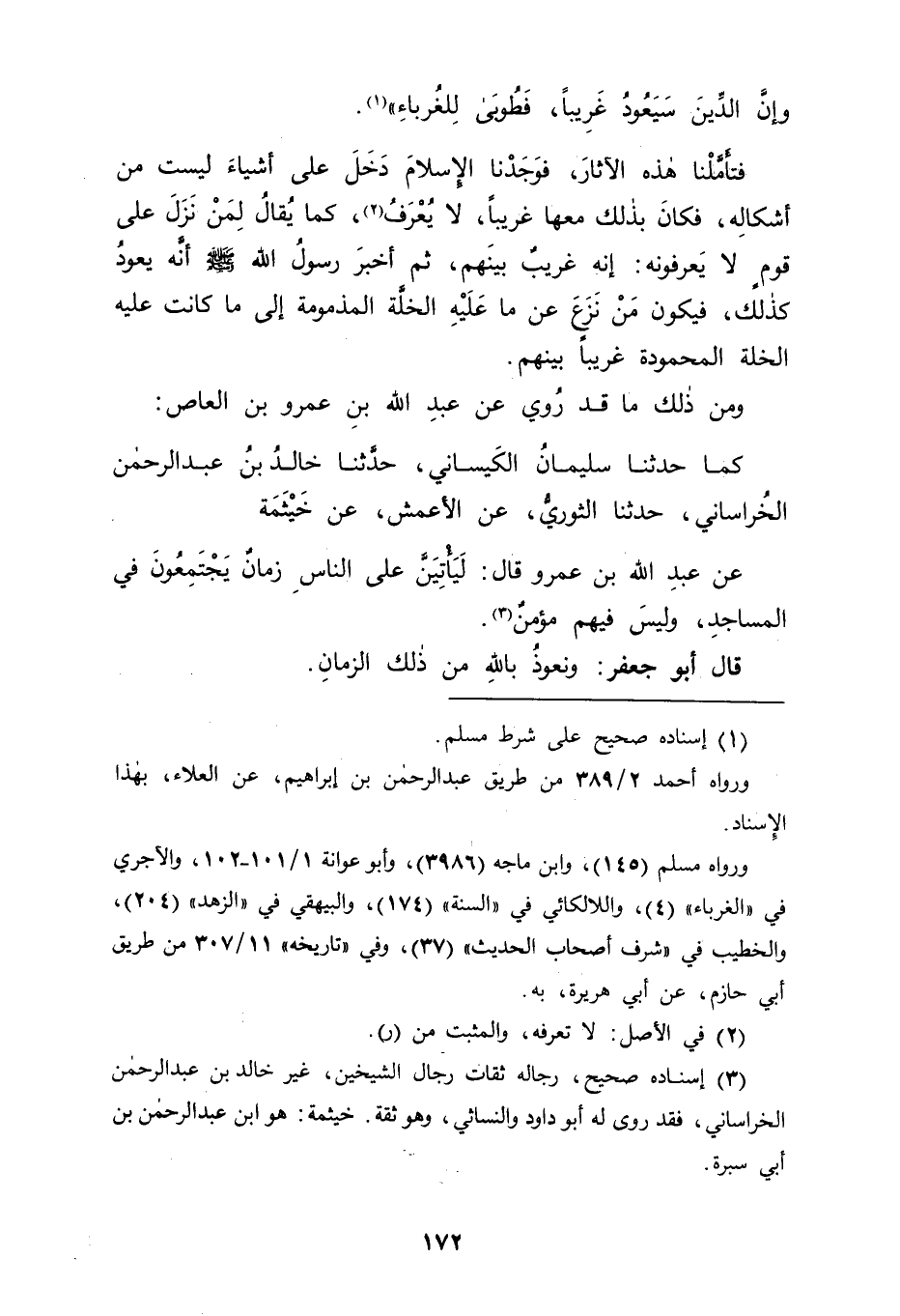 وَمِنْ ذَلِكَ مَا قَدْ رُوِيَ عَنْ عَبْدِ اللهِ بْنِ عَمْرِو بْنِ الْعَاصِ كَمَا حَدَّثَنَا سُلَيْمَانُ الْكَيْسَانِيُّ، حَدَّثَنَا خَالِدُ بْنُ عَبْدِ الرَّحْمَنِ الْخُرَاسَانِيُّ حَدَّثَنَا الثَّوْرِيُّ، عَنِ الْأَعْمَشِ، عَنْ خَيْثَمَةَ، عَنْ عَبْدِ اللهِ بْنِ عَمْرٍو قَالَ: " لَيَأْتِيَنَّ عَلَى النَّاسِ زَمَانٌ يَجْتَمِعُونَ فِي الْمَسَاجِدِ، وَلَيْسَ فِيهِمْ مُؤْمِنٌ " قَالَ أَبُو جَعْفَرٍ: وَنَعُوذُ بِاللهِ مِنْ ذَلِكَ الزَّمَانِ