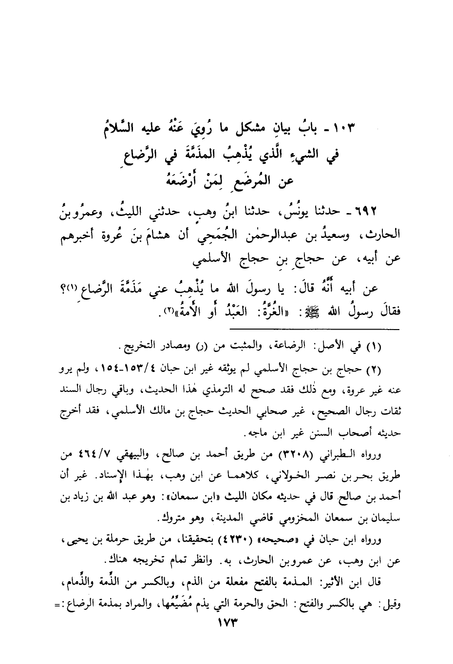 692 - حَدَّثَنَا يُونُسُ، حَدَّثَنَا ابْنُ وَهْبٍ، حَدَّثَنِي اللَّيْثُ، وَعَمْرُو بْنُ الْحَارِثِ، وَسَعِيدُ بْنُ عَبْدِ الرَّحْمَنِ الْجُمَحِيُّ أَنَّ هِشَامَ بْنَ عُرْوَةَ، أَخْبَرَهُمْ عَنْ أَبِيهِ، عَنْ حَجَّاجِ بْنِ حَجَّاجٍ الْأَسْلَمِيِّ، عَنْ أَبِيهِ، أَنَّهُ قَالَ: يَا رَسُولَ اللهِ مَا يُذْهِبُ عَنِّي مَذَمَّةَ الرَّضَاعِ؟ فَقَالَ رَسُولُ اللهِ صَلَّى اللَّهُ عَلَيْهِ وَسَلَّمَ: " " الْغُرَّةُ: الْعَبْدُ، أَوِ الْأَمَةُ " "