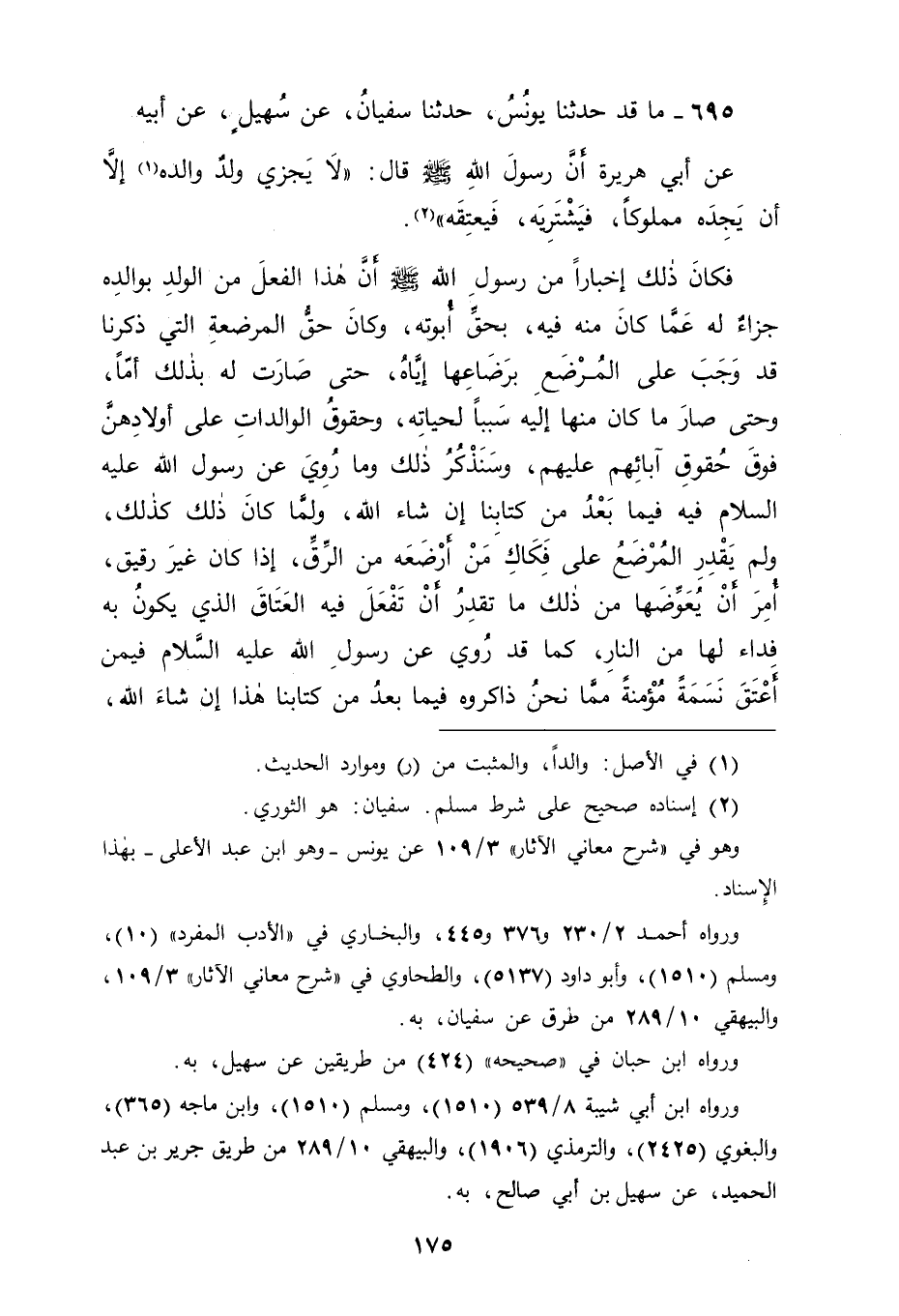 695 - مَا قَدْ حَدَّثَنَا يُونُسُ، حَدَّثَنَا سُفْيَانُ، عَنْ سُهَيْلٍ، عَنْ أَبِيهِ، عَنْ أَبِي هُرَيْرَةَ أَنَّ رَسُولَ اللهِ صَلَّى اللَّهُ عَلَيْهِ وَسَلَّمَ قَالَ: " لَا يَجْزِي وَلَدٌ وَالِدَهُ إلَّا أَنْ يَجِدَهُ مَمْلُوكًا فَيَشْتَرِيَهُ فَيُعْتِقَهُ " فَكَانَ ذَلِكَ إخْبَارًا مِنْ رَسُولِ اللهِ صَلَّى اللَّهُ عَلَيْهِ وَسَلَّمَ أَنَّ هَذَا الْفِعْلَ مِنَ الْوَلَدِ بِوَالِدِهِ جَزَاءٌ لَهُ عَمَّا كَانَ مِنْهُ فِيهِ بِحَقِّ أُبُوَّتِهِ، وَكَانَ حَقُّ الْمُرْضِعَةِ الَّتِي ذَكَرْنَا قَدْ وَجَبَ عَلَى الْمُرْضَعِ بِرَضَاعِهَا إيَّاهُ حَتَّى صَارَتْ لَهُ بِذَلِكَ، أُمًّا وَحَتَّى صَارَ مَا كَانَ مِنْهَا إلَيْهِ سَبَبًا لِحَيَاتِهِ، وَحُقُوقُ الْوَالِدَاتِ عَلَى أَوْلَادِهِنَّ فَوْقَ حُقُوقِ آبَائِهِمْ عَلَيْهِمْ وَسَنَذْكُرُ ذَلِكَ، وَمَا رُوِيَ عَنْ رَسُولِ اللهِ عَلَيْهِ السَّلَامُ فِيهِ فِيمَا بَعْدُ مِنْ كِتَابِنَا إنْ شَاءَ اللهُ، وَلَمَّا كَانَ ذَلِكَ كَذَلِكَ وَلَمْ يَقْدِرِ الْمُرْضَعُ عَلَى فِكَاكِ مَنْ أَرْضَعَهُ مِنَ الرِّقِّ إذَا كَانَ غَيْرَ رَقِيقٍ أَمَرَ أَنْ يُعَوِّضَهَا مِنْ ذَلِكَ مَا تَقْدِرُ أَنْ تَفْعَلَ فِيهِ الْعَتَاقَ الَّذِي يَكُونُ بِهِ فِدَاءً لَهَا مِنَ النَّارِ، كَمَا قَدْ رُوِيَ عَنْ رَسُولِ اللهِ عَلَيْهِ السَّلَامُ فِيمَنْ أَعْتَقَ نَسَمَةً مُؤْمِنَةً مِمَّا نَحْنُ ذَاكِرُوهُ فِيمَا بَعْدُ مِنْ كِتَابِنَا هَذَا إنْ شَاءَ اللهُ، -[176]- وَلَمْ تُجْعَلْ تِلْكَ النَّسَمَةُ كَغَيْرِهَا مِنَ النَّسَمِ، وَجُعِلَتْ مِنْ غُرَرِهَا وَغُرَرُهَا أَرْفَعُهَا