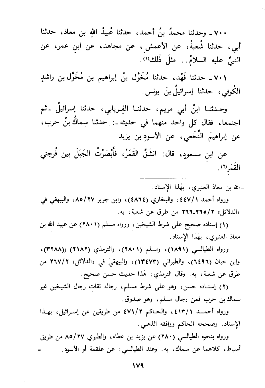 701 - حَدَّثَنَا فَهْدٌ، حَدَّثَنَا مُخَوَّلُ بْنُ إبْرَاهِيمَ بْنِ مُخَوَّلِ بْنِ رَاشِدٍ الْكُوفِيُّ، حَدَّثَنَا إسْرَائِيلُ بْنُ يُونُسَ، وَحَدَّثَنَا ابْنُ أَبِي مَرْيَمَ، حَدَّثَنَا الْفِرْيَابِيُّ، حَدَّثَنَا إسْرَائِيلُ، ثُمَّ اجْتَمَعَا فَقَالَ كُلُّ وَاحِدٍ مِنْهُمَا فِي حَدِيثِهِ: حَدَّثَنَا سِمَاكُ بْنُ حَرْبٍ عَنْ إبْرَاهِيمَ النَّخْعِيِّ، عَنِ الْأَسْوَدِ بْنِ يَزِيدَ، عَنِ ابْنِ مَسْعُودٍ قَالَ: " انْشَقَّ الْقَمَرُ فَأَبْصَرْتُ الْجَبَلَ بَيْنَ فُرْجَتَيِ الْقَمَرِ "