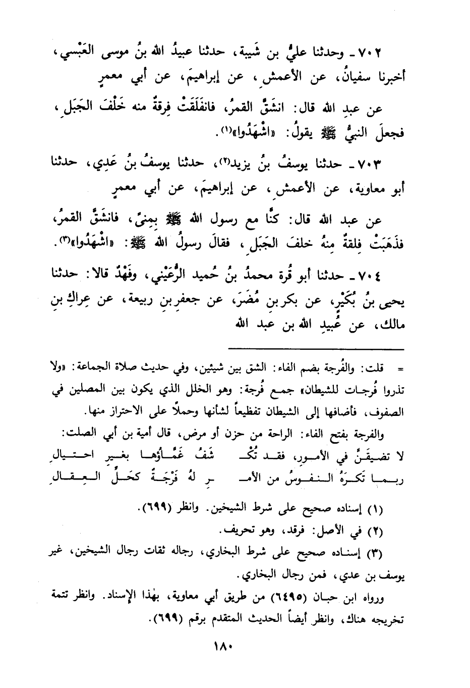 704 - حَدَّثَنَا أَبُو قُرَّةَ مُحَمَّدُ بْنُ حُمَيْدٍ الرُّعَيْنِيُّ، وَفَهْدٌ قَالَا: حَدَّثَنَا يَحْيَى بْنُ بُكَيْرٍ، عَنْ بَكْرِ بْنِ مُضَرَ، عَنْ جَعْفَرِ بْنِ رَبِيعَةَ، عَنْ عِرَاكِ بْنِ مَالِكٍ، عَنْ عُبَيْدِ اللهِ بْنِ عَبْدِ اللهِ، -[181]- عَنِ ابْنِ عَبَّاسٍ قَالَ: " انْشَقَّ الْقَمَرُ فِي زَمَانِ رَسُولِ اللهِ صَلَّى اللَّهُ عَلَيْهِ وَسَلَّمَ "