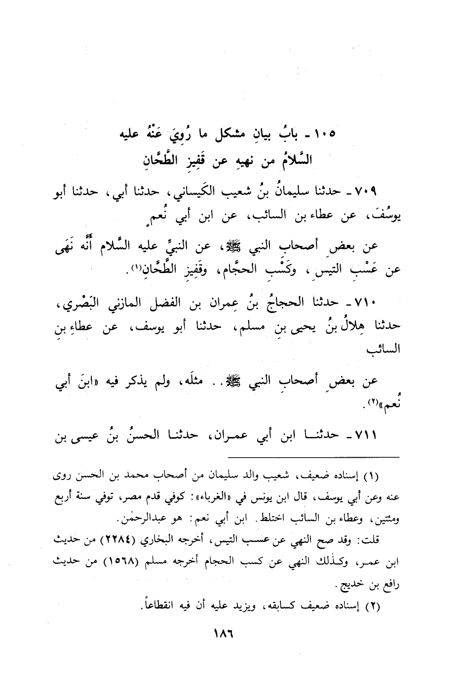 711 - حَدَّثَنَا ابْنُ أَبِي عِمْرَانَ، حَدَّثَنَا الْحَسَنُ بْنُ عِيسَى بْنِ -[187]- مَاسَرْجِسَ مَوْلَى ابْنِ الْمُبَارَكِ وَحَدَّثَنَا يَحْيَى بْنُ عُثْمَانَ بْنِ صَالِحٍ، حَدَّثَنَا نُعَيْمُ بْنُ حَمَّادٍ قَالَا: حَدَّثَنَا ابْنُ الْمُبَارَكِ، عَنْ سُفْيَانَ يَعْنِي الثَّوْرِيَّ، عَنْ هِشَامٍ أَبِي كُلَيْبٍ، عَنِ ابْنِ أَبِي نُعْمٍ، عَنْ أَبِي سَعِيدٍ الْخُدْرِيِّ قَالَ: " نُهِيَ عَنْ عَسْبِ الْفَحْلِ وَعَنْ قَفِيزِ الطَّحَّانِ " -[188]- فَتَأَمَّلْنَا ذَلِكَ فَوَجَدْنَا أَهْلَ الْعِلْمِ لَا يَخْتَلِفُونَ أَنَّ مَعْنَاهُ مَا كَانُوا يَفْعَلُونَهُ فِي الْجَاهِلِيَّةِ وَمَا يَفْعَلُهُ أَهْلُ الْجَهْلِ إلَى يَوْمِنَا هَذَا مِنْ دَفْعِ الْقَمْحِ إلَى الطَّحَّانِ عَلَى أَنْ يَطْحَنَهُ لَهُمْ بِقَفِيزٍ مِنْ دَقِيقِهِ الَّذِي يَطْحَنُهُ مِنْهُ، فَكَانَ ذَلِكَ اسْتِئْجَارًا مِنَ الْمُسْتَأْجِرِ بِمَا لَيْسَ عِنْدَهُ إذَا كَانَ دَقِيقُ قَمْحِهِ لَيْسَ عِنْدَهُ فِي الْوَقْتِ الَّذِي اسْتَأْجَرَ، وَكَانَ فِي ذَلِكَ مَا قَدْ دَلَّ أَنَّ الِاسْتِئْجَارَ لَا يَكُونُ بِمَا لَيْسَ عِنْدَ الْمُسْتَأْجِرِ يَوْمَ يَسْتَأْجِرُ كَمَا لَا يَكُونُ الِابْتِيَاعُ بِمَا لَيْسَ عِنْدَ الْمُبْتَاعِ يَوْمَ يَبِيعُ، وَبِمَا لَيْسَ عِنْدَ الْمُبْتَاعِ يَوْمَ يَبْتَاعُ مِنَ الْأَشْيَاءِ الَّتِي لَيْسَتْ عِنْدَهُ مِمَّا لَيْسَ مَعْنَاهَا مَعْنَى الْأَثْمَانِ كَالدَّرَاهِمِ وَكَالدَّنَانِيرِ، وَكَمَا سِوَاهَا مِنْ ذَوَاتِ الْأَمْثَالِ الَّتِي قَدْ تَكُونُ دَيْنًا فِي الذِّمَمِ، وَبِاللهِ التَّوْفِيقُ