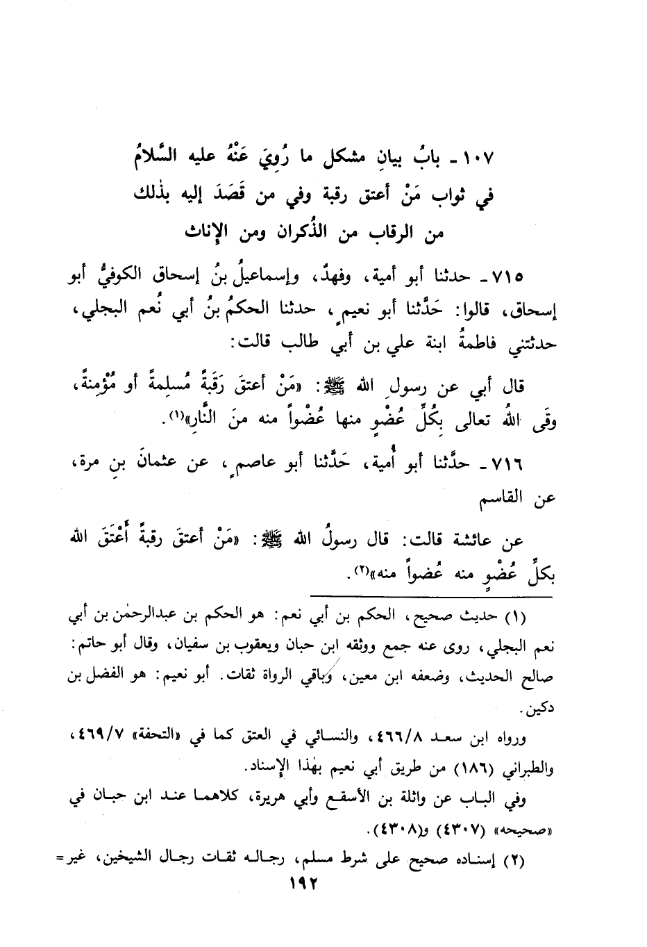 715 - حَدَّثَنَا أَبُو أُمَيَّةَ، وَفَهْدٌ، وَإِسْمَاعِيلُ بْنُ إِسْحَاقَ الْكُوفِيُّ أَبُو إِسْحَاقَ قَالُوا: حَدَّثَنَا أَبُو نُعَيْمٍ، حَدَّثَنَا الْحَكَمُ بْنُ أَبِي نُعْمٍ الْبَجَلِيُّ، حَدَّثَتْنِي فَاطِمَةُ ابْنَةُ عَلِيِّ بْنِ أَبِي طَالِبٍ قَالتْ: قَالَ أَبِي عَنْ رَسُولِ اللهِ صَلَّى اللَّهُ عَلَيْهِ وَسَلَّمَ: " مَنْ أَعْتَقَ رَقَبَةً مُسْلِمَةً، أَوْ مُؤْمِنَةً وَقَى اللهُ تَعَالَى بِكُلِّ عُضْوٍ مِنْهَا عُضْوًا مِنْهُ مِنَ النَّارِ "