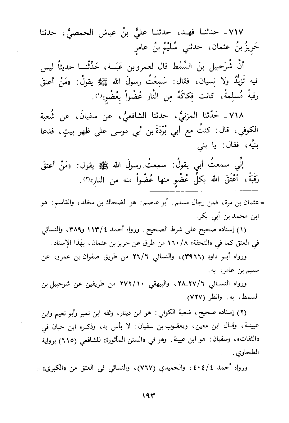 717 - حَدَّثَنَا فَهْدٌ، حَدَّثَنَا عَلِيُّ بْنُ عَيَّاشٍ الْحِمْصِيُّ، حَدَّثَنَا حَرِيزُ بْنُ عُثْمَانَ، حَدَّثَنِي سُلَيْمُ بْنُ عَامِرٍ أَنَّ شُرَحْبِيلَ بْنَ السِّمْطِ قَالَ لِعَمْرِو بْنِ عَبَسَةَ: حَدِّثْنَا حَدِيثًا لَيْسَ فِيهِ تَزَيُّدٌ وَلَا نِسْيَانٌ فَقَالَ: سَمِعْتُ رَسُولَ اللهِ صَلَّى اللَّهُ عَلَيْهِ وَسَلَّمَ يَقُولُ: " مَنْ أَعْتَقَ رَقَبَةً مُسْلِمَةً كَانَتْ فِكَاكَهُ مِنَ النَّارِ عُضْوًا بِعُضْوٍ "