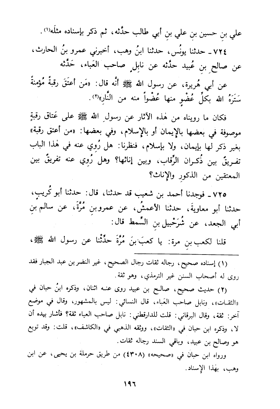 724 - حَدَّثَنَا يُونُسُ، حَدَّثَنَا ابْنُ وَهْبٍ، أَخْبَرَنِي عَمْرُو بْنُ الْحَارِثِ، عَنْ صَالِحِ بْنِ عُبَيْدٍ، حَدَّثَهُ عَنْ نَابِلٍ صَاحِبِ الْعَبَاءِ حَدَّثَهُ عَنْ أَبِي هُرَيْرَةَ، عَنْ رَسُولِ اللهِ صَلَّى اللَّهُ عَلَيْهِ وَسَلَّمَ أَنَّهُ قَالَ: " مَنْ أَعْتَقَ رَقَبَةً مُؤْمِنَةً سَتَرَهُ اللهُ بِكُلِّ عُضْوٍ مِنْهَا عُضْوًا مِنْهُ مِنَ النَّارِ " فَكَانَ مَا رَوَيْنَاهُ مِنْ هَذِهِ الْآثَارِ عَنْ رَسُولِ اللهِ صَلَّى اللَّهُ عَلَيْهِ وَسَلَّمَ عَلَى عَتَاقِ رَقَبَةٍ مَوْصُوفَةٍ فِي بَعْضِهَا بِالْإِيمَانِ، أَوْ بِالْإِسْلَامِ، وَفِي بَعْضِهَا: " مَنْ أَعْتَقَ رَقَبَةً " بِغَيْرِ ذِكْرٍ لَهَا بِإِيمَانٍ وَلَا بِإِسْلَامٍ، فَنَظَرْنَا هَلْ رُوِيَ عَنْهُ فِي هَذَا الْبَابِ تَفْرِيقٌ بَيْنَ ذُكْرَانِ الرِّقَابِ وَبَيْنَ إنَاثِهَا؟ وَهَلْ رُوِيَ عَنْهُ تَفْرِيقٌ بَيْنَ الْمُعْتَقِينَ مِنَ الذُّكُورِ وَالْإِنَاثِ؟