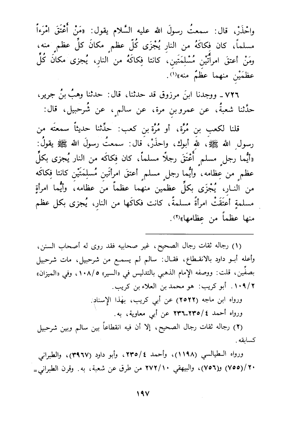 726 - وَوَجَدْنَا ابْنَ مَرْزُوقٍ قَدْ حَدَّثَنَا قَالَ: حَدَّثَنَا وَهْبُ بْنُ جَرِيرٍ، حَدَّثَنَا شُعْبَةُ، عَنْ عَمْرِو بْنِ مُرَّةَ، عَنْ سَالِمٍ، عَنْ شُرَحْبِيلَ قَالَ: قُلْنَا لِكَعْبِ بْنِ مُرَّةَ أَوْ مُرَّةَ بْنِ كَعْبٍ: حَدِّثْنَا حَدِيثًا سَمِعْتَهُ مِنْ رَسُولِ اللهِ صَلَّى اللَّهُ عَلَيْهِ وَسَلَّمَ لِلَّهِ أَبُوكَ وَاحْذَرْ، قَالَ: سَمِعْتُ رَسُولَ اللهِ صَلَّى اللَّهُ عَلَيْهِ وَسَلَّمَ يَقُولُ: " أَيُّمَا رَجُلٍ مُسْلِمٍ أَعْتَقَ رَجُلًا مُسْلِمًا كَانَ فِكَاكَهُ مِنَ النَّارِ يُجْزَى بِكُلِّ عَظْمٍ مِنْ عِظَامِهِ، وَأَيُّمَا رَجُلٍ مُسْلِمٍ أَعْتَقَ امْرَأَتَيْنِ مُسْلِمَتَيْنِ كَانَتَا فِكَاكَهُ مِنَ النَّارِ يُجْزَى بِكُلِّ عَظْمَيْنِ مِنْهُمَا عَظْمًا مِنْ عِظَامِهِ، وَأَيُّمَا امْرَأَةٍ مُسْلِمَةٍ أَعْتَقَتِ امْرَأَةً مُسْلِمَةً كَانَتْ فِكَاكَهَا مِنَ النَّارِ يُجْزَى بِكُلِّ عَظْمٍ مِنْهَا عَظْمٌ مِنْ عِظَامِهَا "
