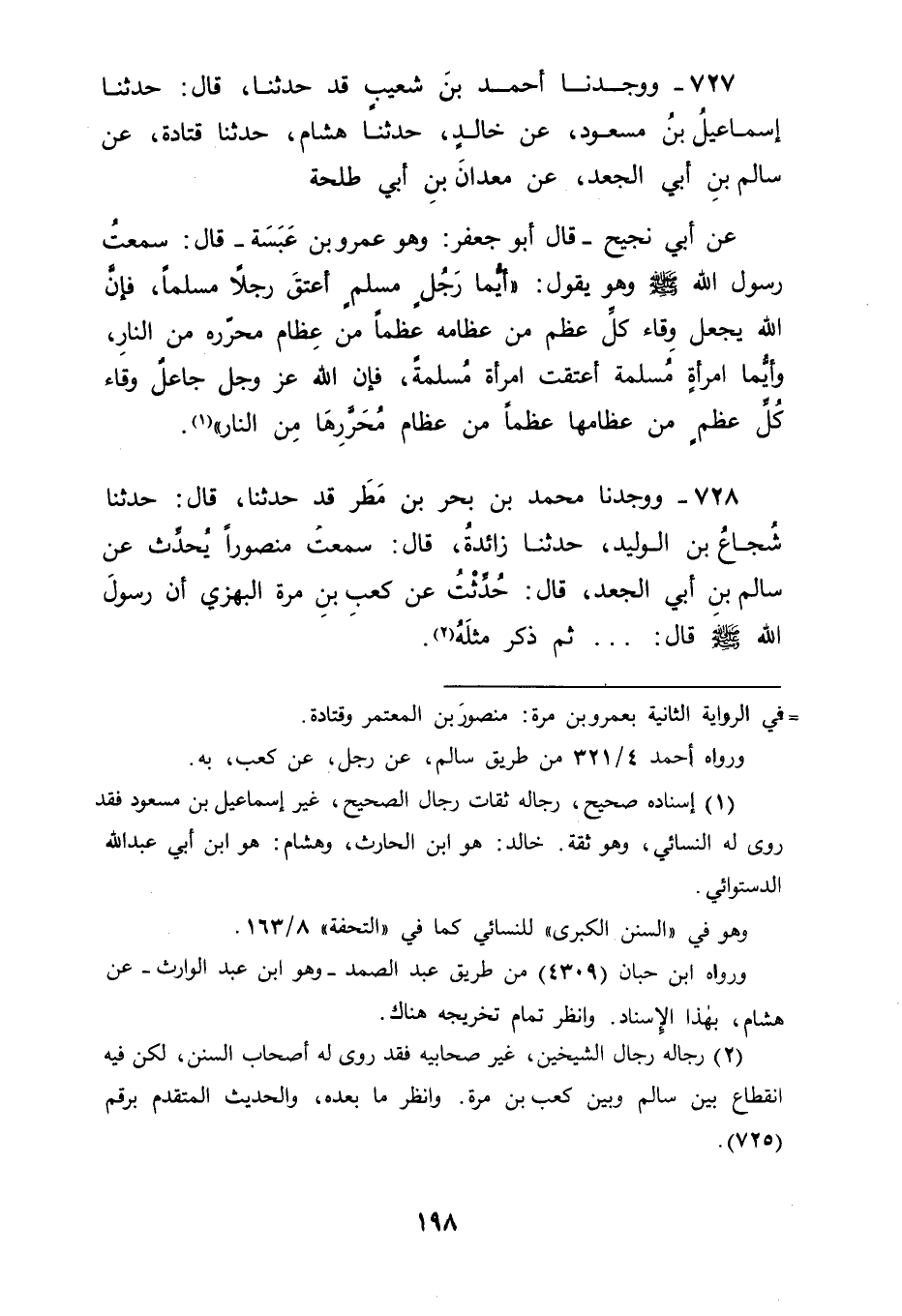 727 - وَوَجَدْنَا أَحْمَدَ بْنَ شُعَيْبٍ قَدْ حَدَّثَنَا قَالَ: حَدَّثَنَا إسْمَاعِيلُ بْنُ مَسْعُودٍ، عَنْ خَالِدٍ، حَدَّثَنَا هِشَامٌ، حَدَّثَنَا قَتَادَةُ، عَنْ سَالِمِ بْنِ أَبِي الْجَعْدِ، عَنْ مَعْدَانَ بْنِ أَبِي طَلْحَةَ، عَنْ أَبِي نَجِيحٍ قَالَ أَبُو جَعْفَرٍ وَهُوَ عَمْرُو بْنُ عَبَسَةَ قَالَ: سَمِعْتُ رَسُولَ اللهِ صَلَّى اللَّهُ عَلَيْهِ وَسَلَّمَ وَهُوَ يَقُولُ: " أَيُّمَا رَجُلٍ مُسْلِمٍ أَعْتَقَ رَجُلًا مُسْلِمًا، فَإِنَّ اللهَ يَجْعَلُ وِقَاءَ كُلِّ عَظْمٍ مِنْ عِظَامِهِ عَظْمًا مِنْ عِظَامِ مُحَرَّرِهِ مِنَ النَّارِ، وَأَيُّمَا امْرَأَةٍ مُسْلِمَةٍ أَعْتَقَتِ امْرَأَةً مُسْلِمَةً فَإِنَّ اللهَ عَزَّ وَجَلَّ جَاعِلٌ وِقَاءَ كُلِّ عَظْمٍ مِنْ عِظَامِهَا عَظْمًا مِنْ عِظَامِ مُحَرَّرِهَا مِنَ النَّارِ "
