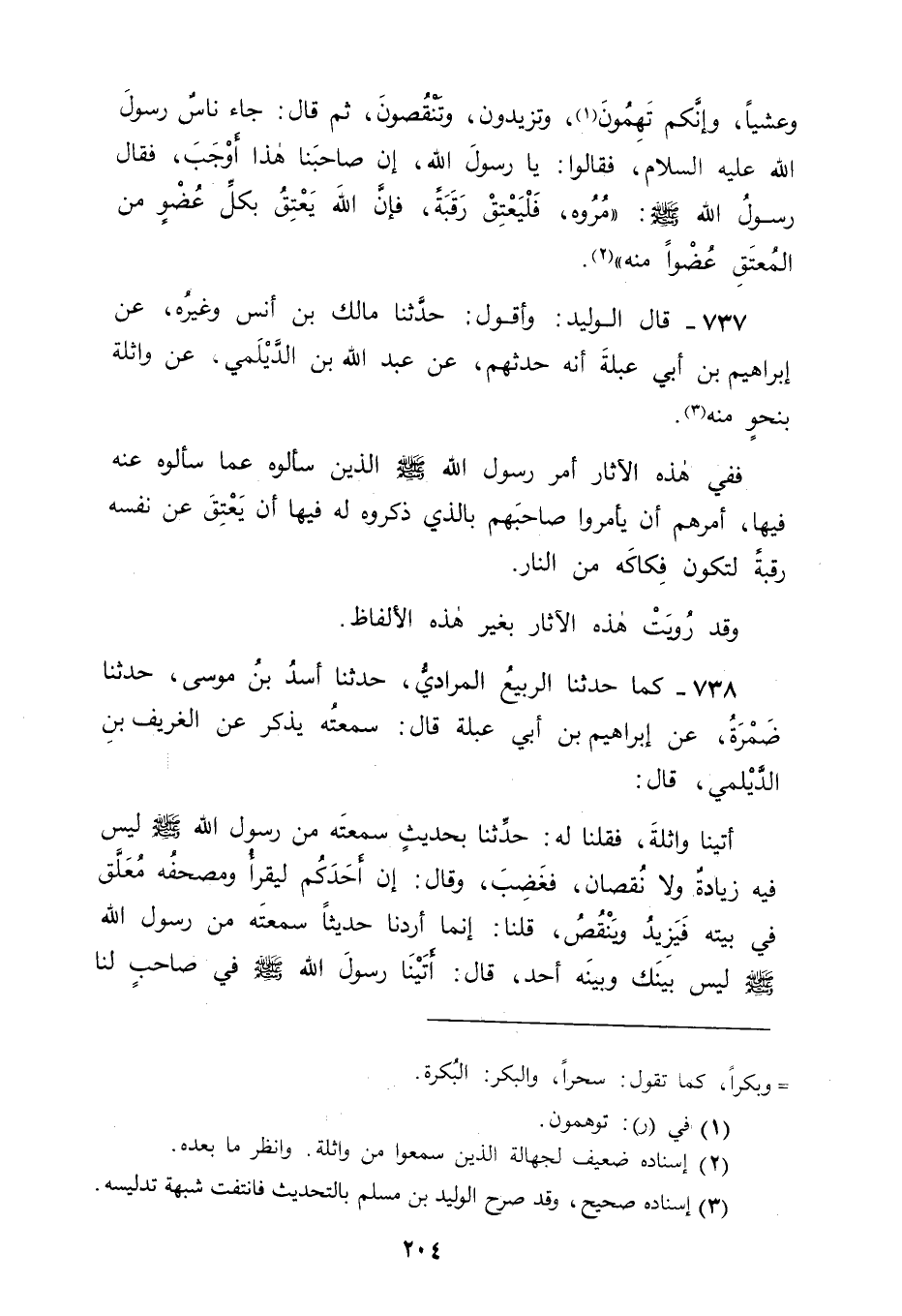 738 - كَمَا حَدَّثَنَا الرَّبِيعُ الْمُرَادِيُّ، حَدَّثَنَا أَسَدُ بْنُ مُوسَى، حَدَّثَنَا ضَمْرَةُ، عَنْ إبْرَاهِيمَ بْنِ أَبِي عَبْلَةَ قَالَ: سَمِعْتُهُ يَذْكُرُ عَنِ الْغَرِيفِ بْنِ الدَّيْلَمِيِّ قَالَ: أَتَيْنَا وَاثِلَةَ فَقُلْنَا لَهُ: حَدِّثْنَا بِحَدِيثٍ سَمِعْتَهُ مِنْ رَسُولِ اللهِ صَلَّى اللَّهُ عَلَيْهِ وَسَلَّمَ لَيْسَ فِيهِ زِيَادَةٌ، وَلَا نُقْصَانٌ، فَغَضِبَ وَقَالَ: إنَّ أَحَدَكُمْ لَيَقْرَأُ وَمُصْحَفُهُ مُعَلَّقٌ فِي بَيْتِهِ فَيَزِيدُ وَيَنْقُصُ، قُلْنَا: إنَّمَا أَرَدْنَا حَدِيثًا سَمِعْتَهُ مِنْ رَسُولِ اللهِ صَلَّى اللَّهُ عَلَيْهِ وَسَلَّمَ لَيْسَ بَيْنَكَ وَبَيْنَهُ أَحَدٌ قَالَ: أَتَيْنَا رَسُولَ اللهِ صَلَّى اللَّهُ عَلَيْهِ وَسَلَّمَ فِي صَاحِبٍ لَنَا -[205]- قَدْ أَوْجَبَ يَعْنِي: النَّارَ بِالْقَتْلِ، فَقَالَ: " أَعْتِقُوا عَنْهُ رَقَبَةً يُعْتِقِ اللهُ بِكُلِّ عُضْوٍ مِنْهُ عُضْوًا مِنْهُ مِنَ النَّارِ "
