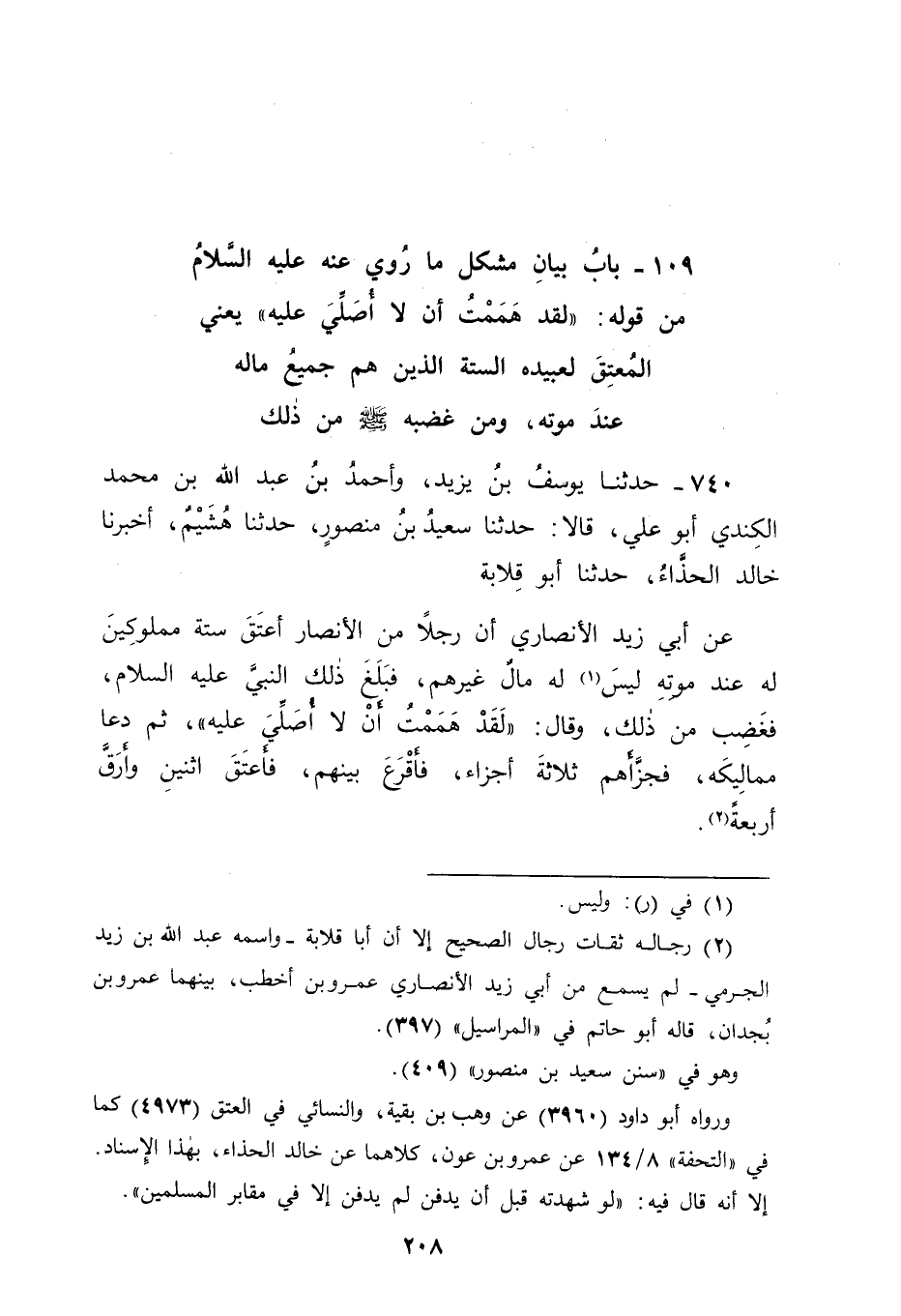 740 - حَدَّثَنَا يُوسُفُ بْنُ يَزِيدَ، وَأَحْمَدُ بْنُ عَبْدِ اللهِ بْنِ مُحَمَّدٍ الْكِنْدِيُّ أَبُو عَلِيٍّ قَالَا: حَدَّثَنَا سَعِيدُ بْنُ مَنْصُورٍ، حَدَّثَنَا هُشَيْمٌ، أَخْبَرَنَا خَالِدٌ الْحَذَّاءُ، أَخْبَرَنَا أَبُو قِلَابَةَ، عَنْ أَبِي زَيْدٍ الْأَنْصَارِيِّ أَنَّ رَجُلًا مِنَ الْأَنْصَارِ أَعْتَقَ سِتَّةً مَمْلُوكِينَ لَهُ عِنْدَ مَوْتِهِ لَيْسَ لَهُ مَالٌ غَيْرُهُمْ، فَبَلَغَ ذَلِكَ النَّبِيَّ عَلَيْهِ السَّلَامُ فَغَضِبَ مِنْ ذَلِكَ وَقَالَ: " لَقَدْ هَمَمْتُ أَنْ لَا أُصَلِّيَ عَلَيْهِ " ثُمَّ دَعَا مَمَالِيكَهُ فَجَزَّأَهُمْ ثَلَاثَةَ أَجْزَاءٍ، فَأَقْرَعَ بَيْنَهُمْ فَأَعْتَقَ اثْنَيْنِ، وَأَرَقَّ أَرْبَعَةً " -[209]-