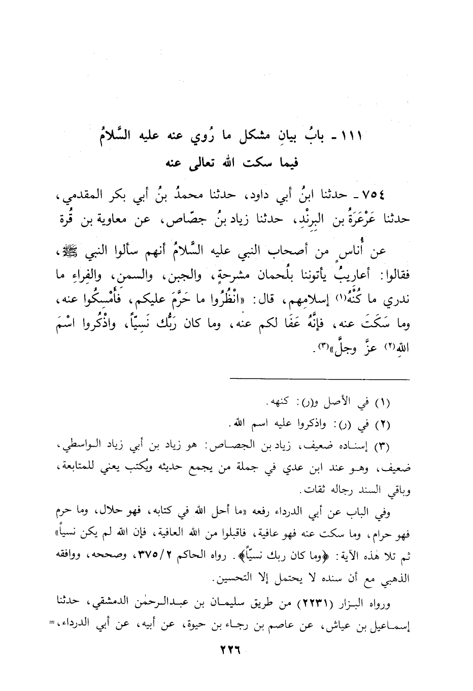 754 - حَدَّثَنَا ابْنُ أَبِي دَاوُدَ، حَدَّثَنَا مُحَمَّدُ بْنُ أَبِي بَكْرٍ الْمُقَدَّمِيُّ، حَدَّثَنَا عَرْعَرَةُ بْنُ الْبِرِنْدِ، حَدَّثَنَا زِيَادُ بْنُ جَصَّاصٍ، عَنْ مُعَاوِيَةَ بْنِ قُرَّةَ، عَنْ أُنَاسٍ مِنْ أَصْحَابِ النَّبِيِّ عَلَيْهِ السَّلَامُ أَنَّهُمْ سَأَلُوا النَّبِيَّ صَلَّى اللَّهُ عَلَيْهِ وَسَلَّمَ، فَقَالُوا: أَعَارِيبُ يَأْتُونَنَا بِلُحْمَانٍ مُشَرَّحَةٍ، وَالْجُبْنِ، وَالسَّمْنِ، وَالْفِرَاءِ، مَا نَدْرِي مَا كُنْهُ إسْلَامِهِمْ؟ قَالَ: " انْظُرُوا مَا حَرَّمَ عَلَيْكُمْ فَأَمْسِكُوا عَنْهُ، وَمَا سَكَتَ عَنْهُ فَإِنَّهُ عَفَا لَكُمْ عَنْهُ، {وَمَا كَانَ رَبُّكَ نَسِيًّا} [مريم: 64] ، وَاذْكُرُوا اسْمَ اللهِ عَزَّ وَجَلَّ " -[227]- وَالْأَشْيَاءُ الْمُرَادَةُ فِي هَذَا عِنْدَنَا , وَاللهُ أَعْلَمُ هِيَ الْأَشْيَاءُ الَّتِي مِنْ جِنْسِ مَا ذُكِرَ فِي هَذَا الْحَدِيثِ تَوْسِعَةً مِنَ اللهِ عَلَى عِبَادِهِ فِي الطَّعَامِ الَّذِي يَأْكُلُونَهُ مِنَ الذَّبَائِحِ الَّتِي أَبَاحَهَا اللهُ لَهُمْ مِنْ أَيْدِي مَنْ أَحَلَّ لَهُمْ ذَبَائِحَهُمْ وَحَرَّمَ عَلَيْهِمْ ذَبَائِحَ أَضْدَادِهِمْ مِنَ الْمَجُوسِ، وَعَبَدَةِ الْأَوْثَانِ وَجَعَلَ لَهُمُ اسْتِعْمَالَ ظَاهِرِهَا , وَعَلَى أَنَّهَا مِمَّا أَحَلَّ حَتَّى يَعْلَمُوا مَا سِوَى ذَلِكَ مِمَّا حَرُمَ عَلَيْهِمْ , وَلَوْ شَاءَ عَزَّ وَجَلَّ لَضَيَّقَ ذَلِكَ عَلَيْهِمْ فَلَمْ يُبِحْهُمْ أَكْلَ شَيْءٍ مِنَ اللُّحْمَانِ حَتَّى يَعْلَمُوا مَنْ ذَابِحُوهَا، وَهَلْ هُمْ -[228]- مِمَّنْ يَحِلُّ ذَبَائِحُهُمْ أَمْ مِمَّنْ سِوَى ذَلِكَ؟ وَكَانَ فِي ذَلِكَ إعْنَاتُ اللهِ تَعَالَى لَهُمْ كَمَا قَالَ: {وَلَوْ شَاءَ اللهُ لَأَعْنَتَكُمْ} [البقرة: 220] وَلَكِنَّهُ خَفَّفَ ذَلِكَ وَرَفَعَهُ عَنْهُمْ رَحْمَةً مِنْهُ لَهُمْ وَتَفَضُّلًا مِنْهُ عَلَيْهِمْ، وَخَالَفَ بَيْنَ ذَلِكَ وَبَيْنَ الشَّرَائِعِ الَّتِي شَرَعَهَا لَهُمْ فِي دِينِهِ وَتَعَبَّدَهُمْ بِهَا فِيهِ، وَأَمَرَهُمْ بِطَلَبِ مُشْكِلِهَا مِنْ مُحْكَمِهَا وَمِنْ مَا يُطْلَبُ مِنْ مِثْلِهِ عَلَى مَا ذَكَرْنَاهُ فِي الْبَابِ الَّذِي قَبْلَ هَذَا الْبَابِ، وَمِثْلُ هَذَا الْحَدِيثِ مَا رُوِيَ عَنِ ابْنِ عَبَّاسٍ مِمَّا: