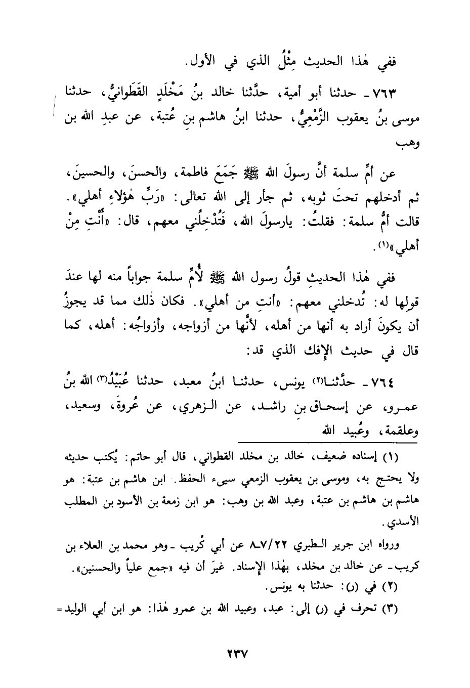 763 - حَدَّثَنَا أَبُو أُمَيَّةَ، حَدَّثَنَا خَالِدُ بْنُ مَخْلَدٍ الْقَطَوَانِيُّ، حَدَّثَنَا مُوسَى بْنُ يَعْقُوبَ الزَّمْعِيُّ، حَدَّثَنَا ابْنُ هَاشِمِ بْنُ عُتْبَةَ، عَنْ عَبْدِ اللهِ بْنِ وَهْبٍ، عَنْ أُمِّ سَلَمَةَ أَنَّ رَسُولَ اللهِ صَلَّى اللَّهُ عَلَيْهِ وَسَلَّمَ جَمَعَ فَاطِمَةَ، وَالْحَسَنَ، وَالْحُسَيْنَ , ثُمَّ أَدْخَلَهُمْ تَحْتَ ثَوْبِهِ ثُمَّ جَأَرَ إلَى اللهِ تَعَالَى: " رَبِّ هَؤُلَاءِ أَهْلِي " قَالَتْ أُمُّ سَلَمَةَ: فَقُلْتُ: يَا رَسُولَ اللهِ فَتُدْخِلُنِي مَعَهُمْ؟ قَالَ: " أَنْتِ مِنْ أَهْلِي " فَفِي هَذَا الْحَدِيثِ قَوْلُ رَسُولِ اللهِ صَلَّى اللَّهُ عَلَيْهِ وَسَلَّمَ لِأُمِّ سَلَمَةَ جَوَابًا مِنْهُ لَهَا عِنْدَ قَوْلِهَا لَهُ: تُدْخِلُنِي مَعَهُمْ: " أَنْتِ مِنْ أَهْلِي " فَكَانَ ذَلِكَ مِمَّا قَدْ يُجَوِّزُ أَنْ يَكُونَ أَرَادَ بِهِ أَنَّهَا مِنْ أَهْلِهِ؛ لِأَنَّهَا مِنْ أَزْوَاجِهِ وَأَزْوَاجُهُ أَهْلُهُ، كَمَا قَالَ فِي حَدِيثِ الْإِفْكِ الَّذِي قَدْ