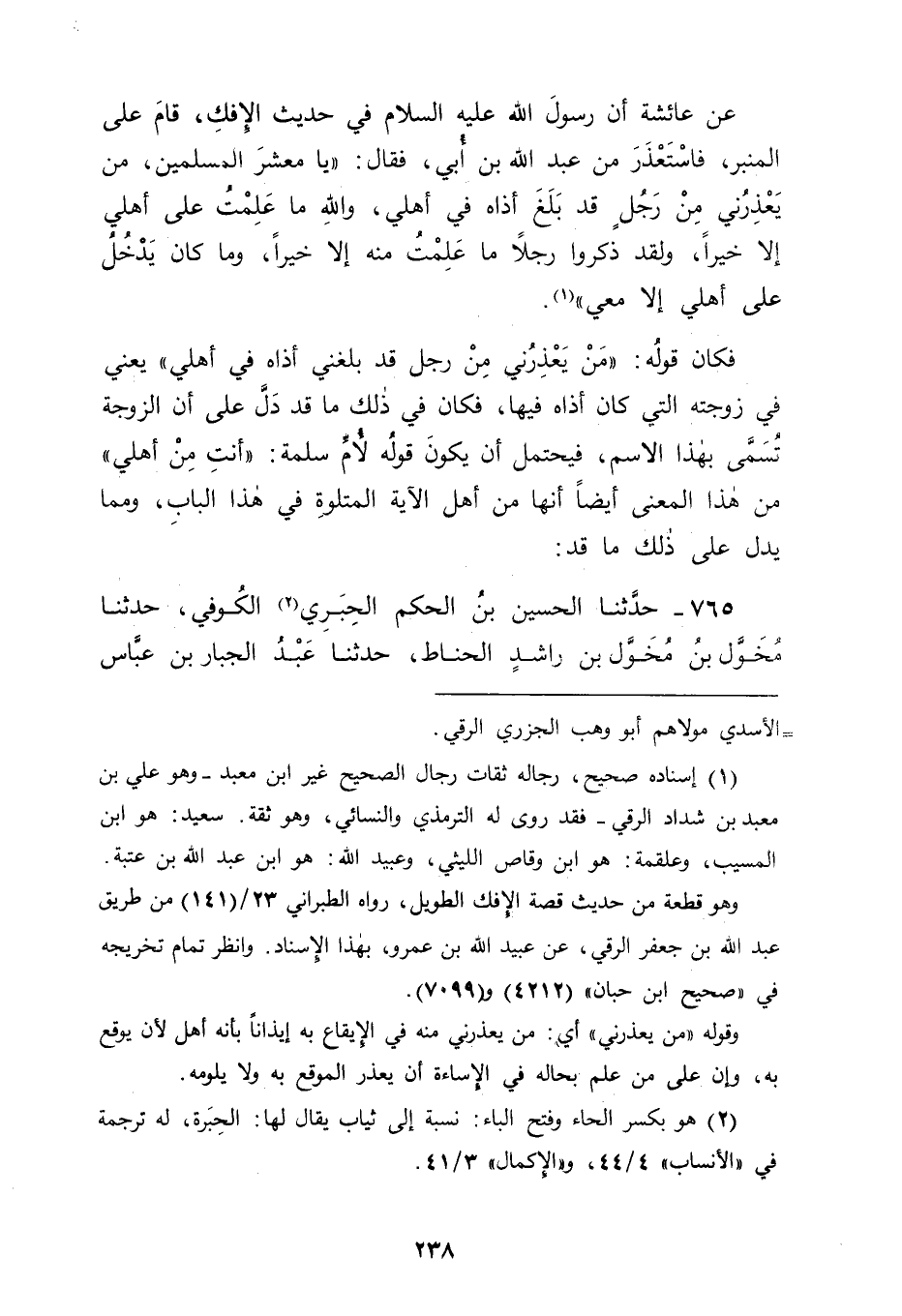 765 - حَدَّثَنَا الْحُسَيْنُ بْنُ الْحَكَمِ الْحِبَرِيُّ الْكُوفِيُّ، حَدَّثَنَا مُخَوَّلُ بْنُ مُخَوَّلِ بْنِ رَاشِدٍ الْحَنَّاطُ، حَدَّثَنَا عَبْدُ الْجَبَّارِ بْنُ عَبَّاسٍ -[239]- الشِّبَامِيُّ، عَنْ عَمَّارٍ الدُّهْنِيِّ، عَنْ عَمْرَةَ بِنْتِ أَفْعَى، عَنْ أُمِّ سَلَمَةَ قَالتْ: نَزَلَتْ هَذِهِ الْآيَةُ فِي بَيْتِي: {إنَّمَا يُرِيدُ اللهُ لِيُذْهِبَ عَنْكُمُ الرِّجْسَ أَهْلَ الْبَيْتِ وَيُطَهِّرَكُمْ تَطْهِيرًا} [الأحزاب: 33] ، يَعْنِي فِي سَبْعَةٍ جِبْرِيلَ، وَمِيكَائِيلَ، وَرَسُولِ اللهِ صَلَّى اللَّهُ عَلَيْهِ وَسَلَّمَ، وَعَلِيٍّ، وَفَاطِمَةَ، وَالْحَسَنِ، وَالْحُسَيْنِ عَلَيْهِمُ السَّلَامُ وَأَنَا عَلَى بَابِ الْبَيْتِ فَقُلْتُ: يَا رَسُولَ اللهِ أَلَسْتُ مِنْ أَهْلِ الْبَيْتِ؟ قَالَ: " إنَّكِ مِنْ أَزْوَاجِ النَّبِيِّ عَلَيْهِ السَّلَامُ " وَمَا قَالَ: إنَّكِ مِنْ أَهْلِ الْبَيْتِ