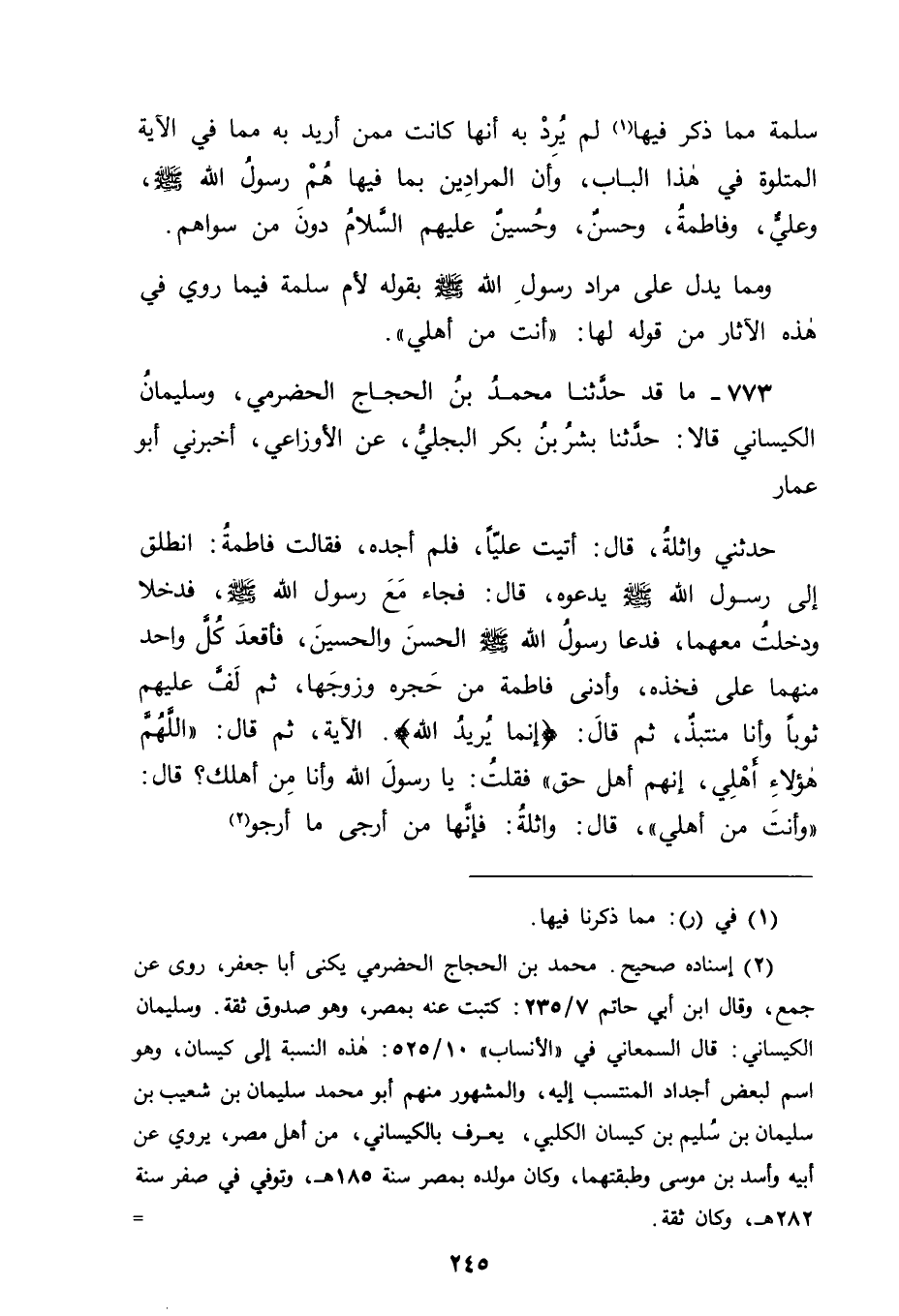 773 - مَا قَدْ حَدَّثَنَا مُحَمَّدُ بْنُ الْحَجَّاجِ الْحَضْرَمِيُّ، وَسُلَيْمَانُ الْكَيْسَانِيُّ قَالَا: حَدَّثَنَا بِشْرُ بْنُ بَكْرٍ الْبَجَلِيُّ، عَنِ الْأَوْزَاعِيِّ، أَخْبَرَنِي أَبُو عَمَّارٍ، حَدَّثَنِي وَاثِلَةُ قَالَ: أَتَيْتُ عَلِيًّا فَلَمْ أَجِدْهُ، فَقَالَتْ فَاطِمَةُ انْطَلَقَ إلَى رَسُولِ اللهِ صَلَّى اللَّهُ عَلَيْهِ وَسَلَّمَ يَدْعُوهُ قَالَ: فَجَاءَ مَعَ رَسُولِ اللهِ صَلَّى اللَّهُ عَلَيْهِ وَسَلَّمَ، فَدَخَلَا وَدَخَلْتُ مَعَهُمَا فَدَعَا رَسُولُ اللهِ صَلَّى اللَّهُ عَلَيْهِ وَسَلَّمَ الْحَسَنَ، وَالْحُسَيْنَ فَأَقْعَدَ كُلَّ وَاحِدٍ مِنْهُمَا عَلَى فَخِذِهِ، وَأَدْنَى فَاطِمَةَ مِنْ حِجْرِهِ وَزَوْجَهَا , ثُمَّ لَفَّ عَلَيْهِمْ ثَوْبًا وَأَنَا مُنْتَبِذٌ , ثُمَّ قَالَ: {إنَّمَا يُرِيدُ اللهُ} [التوبة: 55] الْآيَةَ , ثُمَّ قَالَ: " اللهُمَّ هَؤُلَاءِ أَهْلِي إنَّهُمْ أَهْلُ حَقٍّ " فَقُلْتُ: يَا رَسُولَ اللهِ وَأَنَا مِنْ أَهْلِكَ قَالَ: " وَأَنْتَ مِنْ أَهْلِي " قَالَ: وَاثِلَةُ فَإِنَّهَا مِنْ أَرْجَى مَا أَرْجُو. -[246]- وَوَاثِلَةُ أَبْعَدُ مِنْهُ عَلَيْهِ السَّلَامُ مِنْ أُمِّ سَلَمَةَ مِنْهُ؛ لِأَنَّهُ إنَّمَا هُوَ رَجُلٌ مِنْ بَنِي لَيْثٍ لَيْسَ مِنْ قُرَيْشٍ وَأُمُّ سَلَمَةَ مَوْضِعُهَا مِنْ قُرَيْشٍ مَوْضِعُهَا الَّذِي هِيَ بِهِ مِنْهُ، فَكَانَ قَوْلُهُ لِوَاثِلَةَ: " أَنْتَ مِنْ أَهْلِي " عَلَى مَعْنَى لِاتِّبَاعِكَ إيَّايَ، وَإِيمَانِكَ بِي فَدَخَلْتَ بِذَلِكَ فِي جُمْلَتِي، وَقَدْ وَجَدْنَا اللهَ قَدْ ذَكَرَ فِي كِتَابِهِ مَا يَدُلُّ عَلَى هَذَا الْمَعْنَى بِقَوْلِهِ: {وَنَادَى نُوحٌ رَبَّهُ، فَقَالَ رَبِّ إنَّ ابْنِي مِنْ أَهْلِي} [هود: 45] فَأَجَابَهُ فِي ذَلِكَ بِأَنْ قَالَ لَهُ: {إنَّهُ لَيْسَ مِنْ أَهْلِكَ إنَّهُ عَمَلٌ غَيْرُ صَالِحٍ} [هود: 46] فَكَمَا جَازَ أَنْ يُخْرِجَهُ مِنْ أَهْلِهِ، وَإِنْ كَانَ ابْنَهُ؛ لِخِلَافِهِ إيَّاهُ فِي دِينِهِ جَازَ أَنْ يُدْخِلَ فِي أَهْلِهِ مَنْ يُوَافِقُهُ عَلَى دِينِهِ وَإِنْ لَمْ يَكُنْ مِنْ ذَوِي نَسَبِهِ، فَمِثْلُ ذَلِكَ أَيْضًا مَا كَانَ مِنْ رَسُولِ اللهِ صَلَّى اللَّهُ عَلَيْهِ وَسَلَّمَ جَوَابًا لِأُمِّ سَلَمَةَ: " أَنْتِ مِنْ أَهْلِي " يُحْتَمَلُ أَنْ يَكُونَ عَلَى هَذَا الْمَعْنَى أَيْضًا، وَأَنْ يَكُونَ قَوْلُهُ لَهَا ذَلِكَ كَقَوْلِهِ مِثْلَهُ لِوَاثِلَةَ وَحَدِيثُ سَعْدٍ وَمَا قَدْ ذَكَرْنَاهُ مَعَهُ مِنَ -[247]- الْأَحَادِيثِ فِي أَوَّلِ هَذَا الْبَابِ مَعْقُولٌ بِهَا مِنْ أَهْلِ الْآيَةِ الْمَتْلُوَّةِ فِيهَا؛ لِأَنَّا قَدْ أَحَطْنَا عِلْمًا أَنَّ رَسُولَ اللهِ صَلَّى اللَّهُ عَلَيْهِ وَسَلَّمَ لَمَّا دَعَا مَنْ دَعَا مِنْ أَهْلِهِ عِنْدَ نُزُولِهَا لَمْ يُبْقِ مِنْ أَهْلِهَا الْمُرَادِينَ فِيهَا أَحَدًا سِوَاهُمْ , وَإِذَا كَانَ ذَلِكَ كَذَلِكَ اسْتَحَالَ أَنْ يُدْخِلَ مَعَهُمْ فِيمَا أُرِيدَتْ بِهِ سِوَاهُمْ، وَفِيمَا ذَكَرْنَا مِنْ ذَلِكَ بَيَانُ مَا وَصَفْنَا. فَإِنْ قَالَ قَائِلٌ: فَإِنَّ كِتَابَ اللهِ يَدُلُّ عَلَى أَنَّ أَزْوَاجَ النَّبِيِّ صَلَّى اللَّهُ عَلَيْهِ وَسَلَّمَ هُمُ الْمَقْصُودُونَ بِتِلْكَ الْآيَةِ؛ لِأَنَّهُ قَالَ قَبْلَهَا فِي السُّورَةِ الَّتِي هِيَ فِيهَا: {يَا أَيُّهَا النَّبِيُّ قُلْ لِأَزْوَاجِكَ إنْ كُنْتُنَّ} [الأحزاب: 28] إلَى قَوْلِهِ: {يَا نِسَاءَ النَّبِيِّ لَسْتُنَّ} [الأحزاب: 32] إلَى قَوْلِهِ: {الْجَاهِلِيَّةِ الْأُولَى} [الأحزاب: 33] فَكَانَ ذَلِكَ كُلُّهُ يُرَدْنَ بِهِ؛ لِأَنَّهُ عَلَى خِطَابِ النِّسَاءِ لَا عَلَى خِطَابِ الرِّجَالِ , ثُمَّ قَالَ: {إنَّمَا يُرِيدُ اللهُ لِيُذْهِبَ عَنْكُمُ الرِّجْسَ} [الأحزاب: 33] الْآيَةَ، فَكَانَ جَوَابُنَا لَهُ أَنَّ الَّذِي تَلَاهُ إل