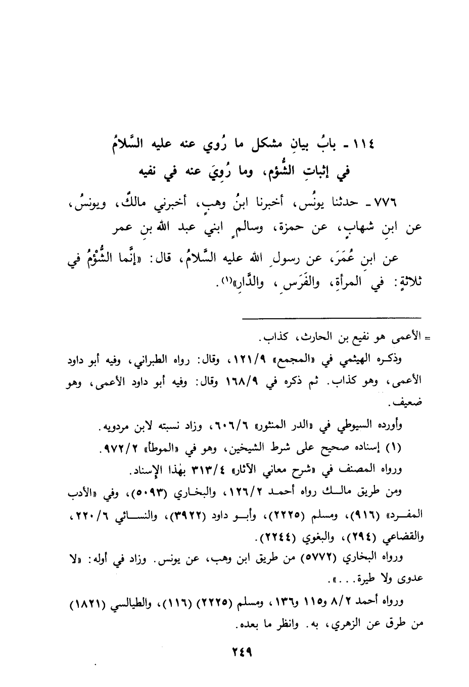 بَابُ بَيَانِ مُشْكِلِ مَا رُوِيَ عَنْهُ عَلَيْهِ السَّلَامُ فِي إثْبَاتِ الشُّؤْمِ، وَمَا رُوِيَ عَنْهُ فِي نَفْيِهِ