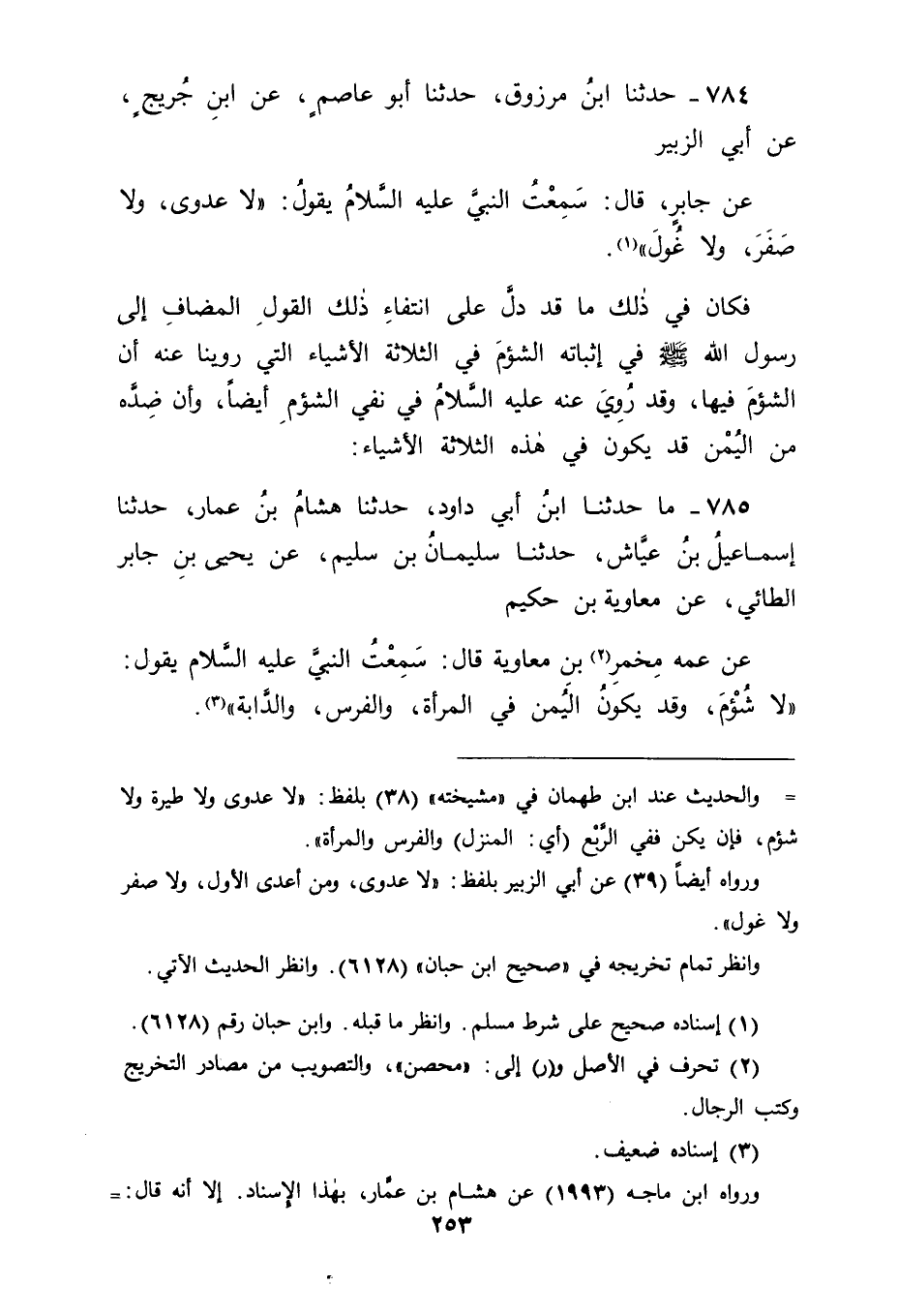784 - حَدَّثَنَا ابْنُ مَرْزُوقٍ، حَدَّثَنَا أَبُو عَاصِمٍ، عَنِ ابْنِ جُرَيْجٍ، عَنْ أَبِي الزُّبَيْرِ، عَنْ جَابِرٍ قَالَ: سَمِعْتُ النَّبِيَّ عَلَيْهِ السَّلَامُ يَقُولُ: " لَا عَدْوَى وَلَا صَفَرَ وَلَا غُولَ " فَكَانَ فِي ذَلِكَ مَا قَدْ دَلَّ عَلَى انْتِفَاءِ ذَلِكَ الْقَوْلِ الْمُضَافِ إلَى رَسُولِ اللهِ صَلَّى اللَّهُ عَلَيْهِ وَسَلَّمَ فِي إثْبَاتِهِ الشُّؤْمَ فِي الثَّلَاثَةِ الْأَشْيَاءِ الَّتِي رَوَيْنَا عَنْهُ أَنَّ الشُّؤْمَ فِيهَا، وَقَدْ رُوِيَ عَنْهُ عَلَيْهِ السَّلَامُ فِي نَفْيِ الشُّؤْمِ أَيْضًا وَأَنَّ ضِدَّهُ مِنَ الْيُمْنِ قَدْ يَكُونُ فِي هَذِهِ الثَّلَاثَةِ الْأَشْيَاءِ