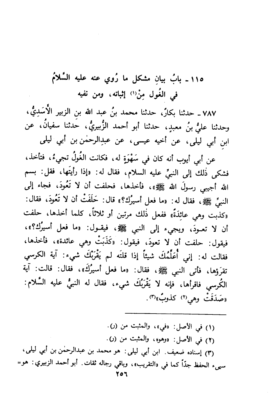 787 - حَدَّثَنَا بَكَّارٌ، حَدَّثَنَا مُحَمَّدُ بْنُ عَبْدِ اللهِ بْنِ الزُّبَيْرِ الْأَسَدِيُّ، وَحَدَّثَنَا عَلِيُّ بْنُ مَعْبَدٍ، حَدَّثَنَا أَبُو أَحْمَدَ الزُّبَيْرِيُّ، حَدَّثَنَا سُفْيَانُ، عَنِ ابْنِ أَبِي لَيْلَى، عَنْ أَخِيهِ عِيسَى عَنْ عَبْدِ الرَّحْمَنِ بْنِ أَبِي لَيْلَى، عَنْ أَبِي أَيُّوبَ أَنَّهُ كَانَ فِي سَهْوَةٍ لَهُ فَكَانَتِ الْغُولُ تَجِيءُ فَتَأْخُذُ، فَشَكَا ذَلِكَ إلَى النَّبِيِّ عَلَيْهِ السَّلَامُ فَقَالَ لَهُ: " إذَا رَأَيْتَهَا فَقُلْ بِسْمِ اللهِ أَجِيبِي رَسُولَ اللهِ صَلَّى اللَّهُ عَلَيْهِ وَسَلَّمَ " فَأَخَذَهَا، فَحَلَفَتْ أَنْ لَا تَعُودَ، فَجَاءَ إلَى النَّبِيِّ صَلَّى اللَّهُ عَلَيْهِ وَسَلَّمَ فَقَالَ لَهُ: " مَا فَعَلَ أَسِيرُكَ؟ " قَالَ: حَلَفَتْ أَنْ لَا تَعُودَ، فَقَالَ: " كَذَبَتْ وَهِيَ عَائِدَةٌ "، فَفَعَلَ ذَلِكَ مَرَّتَيْنِ، أَوْ ثَلَاثًا كُلَّمَا أَخَذَهَا حَلَفَتْ أَنْ لَا تَعُودَ، وَيَجِيءَ إلَى النَّبِيِّ صَلَّى اللَّهُ عَلَيْهِ وَسَلَّمَ، فَيَقُولَ: " مَا فَعَلَ أَسِيرُكَ؟ " فَيَقُولُ: حَلَفَتْ أَنْ لَا تَعُودَ، فَيَقُولُ: " كَذَبَتْ وَهِيَ عَائِدَةٌ "، فَأَخَذَهَا فَقَالَتْ لَهُ: إنِّي أُعَلِّمُكَ شَيْئًا إذَا قُلْتَهُ لَمْ يَقْرَبْكَ شَيْءٌ، آيَةُ الْكُرْسِيِّ تَقْرَؤُهَا فَأَتَى النَّبِيَّ صَلَّى اللَّهُ عَلَيْهِ وَسَلَّمَ، فَقَالَ: " مَا فَعَلَ أَسِيرُكَ؟ " فَقَالَ: قَالَتْ: آيَةُ الْكُرْسِيِّ فَاقْرَأْهَا فَإِنَّهُ لَا يَقْرَبُكَ شَيْءٌ، فَقَالَ لَهُ النَّبِيُّ عَلَيْهِ السَّلَامُ " صَدَقَتْ وَهِيَ كَذُوبٌ " -[257]- فَفِي هَذَا الْحَدِيثِ إثْبَاتُ رَسُولِ اللهِ صَلَّى اللَّهُ عَلَيْهِ وَسَلَّمَ الْغُولَ. وَقَدْ ذَكَرْنَا فِي الْبَابِ الَّذِي قَبْلَ هَذَا الْبَابِ عَنْهُ أَنَّهُ قَالَ: " لَا غُولَ " فَفِي ذَلِكَ نَفْيُهُ لِلْغُولِ فَقَالَ قَائِلٌ: قَدْ يَكُونُ هَذَا عَلَى التَّضَادِّ , فَقِيلَ لَهُ: لَيْسَ ذَلِكَ بِحَمْدِ اللهِ عَلَى التَّضَادِّ إذْ كَانَ قَدْ يُحْتَمَلُ أَنْ يَكُونَ الْغُولُ قَدْ كَانَ مَا فِي حَدِيثِ أَبِي أَيُّوبَ , ثُمَّ رَفَعَهُ اللهُ تَعَالَى عَنْ عِبَادِهِ عَلَى مَا فِي حَدِيثِ جَابِرٍ وَذَلِكَ أَوْلَى مَا حُمِلَتْ عَلَيْهِ الْآثَارُ الْمَرْوِيَّةُ عَنْ رَسُولِ اللهِ صَلَّى اللَّهُ عَلَيْهِ وَسَلَّمَ فِي هَذَا، وَفِيمَا أَشْبَهَهُ مَا وُجِدَ السَّبِيلُ إلَى ذَلِكَ