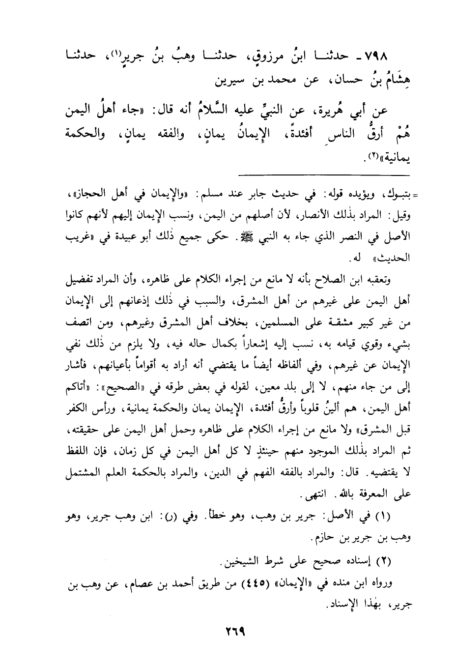 798 - حَدَّثَنَا ابْنُ مَرْزُوقٍ، حَدَّثَنَا وَهْبُ بْنُ جَرِيرٍ، حَدَّثَنَا هِشَامُ بْنُ حَسَّانَ، عَنْ مُحَمَّدِ بْنِ سِيرِينَ، عَنْ أَبِي هُرَيْرَةَ، عَنَ النَّبِيِّ عَلَيْهِ السَّلَامُ أَنَّهُ قَالَ: " جَاءَ أَهْلُ الْيَمَنِ هُمْ أَرَقُّ النَّاسِ أَفْئِدَةً، الْإِيمَانُ يَمَانٍ، وَالْفِقْهُ يَمَانٍ، وَالْحِكْمَةُ يَمَانِيَّةٌ " -[270]-