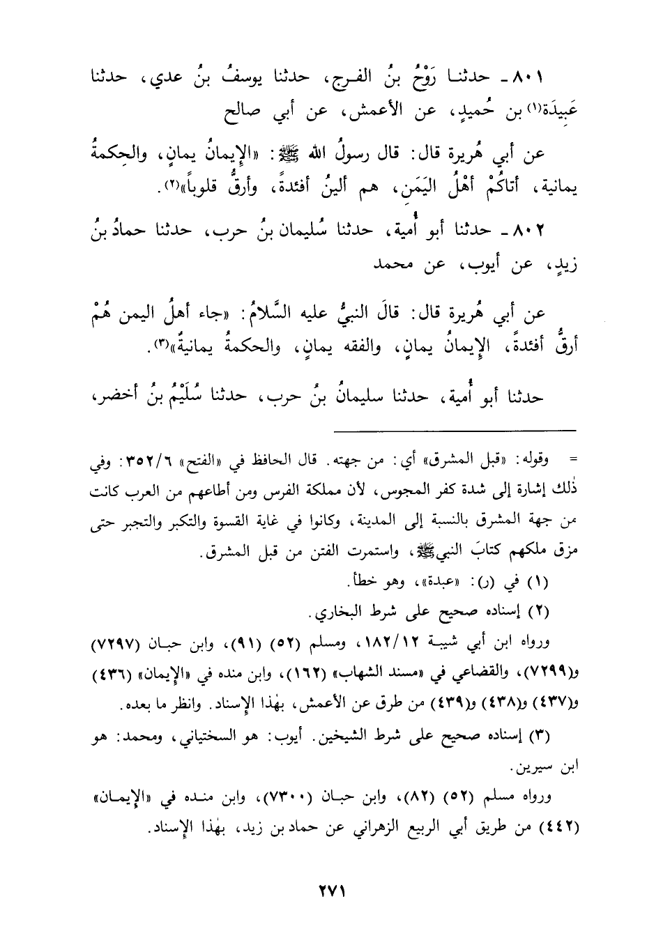 802 - حَدَّثَنَا أَبُو أُمَيَّةَ، حَدَّثَنَا سُلَيْمَانُ بْنُ حَرْبٍ، حَدَّثَنَا حَمَّادُ بْنُ زَيْدٍ، عَنْ أَيُّوبَ، عَنْ مُحَمَّدٍ، عَنْ أَبِي هُرَيْرَةَ قَالَ: قَالَ النَّبِيُّ عَلَيْهِ السَّلَامُ: " جَاءَ أَهْلُ الْيَمَنِ هُمْ أَرَقُّ أَفْئِدَةً، الْإِيمَانُ يَمَانٍ وَالْفِقْهُ يَمَانٍ وَالْحِكْمَةُ يَمَانِيَّةٌ " حَدَّثَنَا أَبُو أُمَيَّةَ، حَدَّثَنَا سُلَيْمَانُ بْنُ حَرْبٍ، حَدَّثَنَا سُلَيْمُ بْنُ أَخْضَرَ، -[272]- عَنِ ابْنِ عَوْنٍ أَنَّ مُحَمَّدًا كَانَ يَرْفَعُ هَذَا الْحَدِيثَ مِنْ حَدِيثِ أَبِي هُرَيْرَةَ وَيَقُولُهُ عَنَ النَّبِيِّ عَلَيْهِ السَّلَامُ. فَفِيمَا رَوَيْنَا عَنْ رَسُولِ اللهِ عَلَيْهِ السَّلَامُ ذِكْرُهُ أَهْلَ الْيَمَنِ بِمَا ذَكَرَهُمْ بِهِ فِي هَذَا الْحَدِيثِ فَذَهَبَ قَوْمٌ إلَى أَنَّهُ إنَّمَا عَنَى بِهِ أَهْلَ تِهَامَةَ مِنْهُمْ سُفْيَانُ بْنُ عُيَيْنَةَ