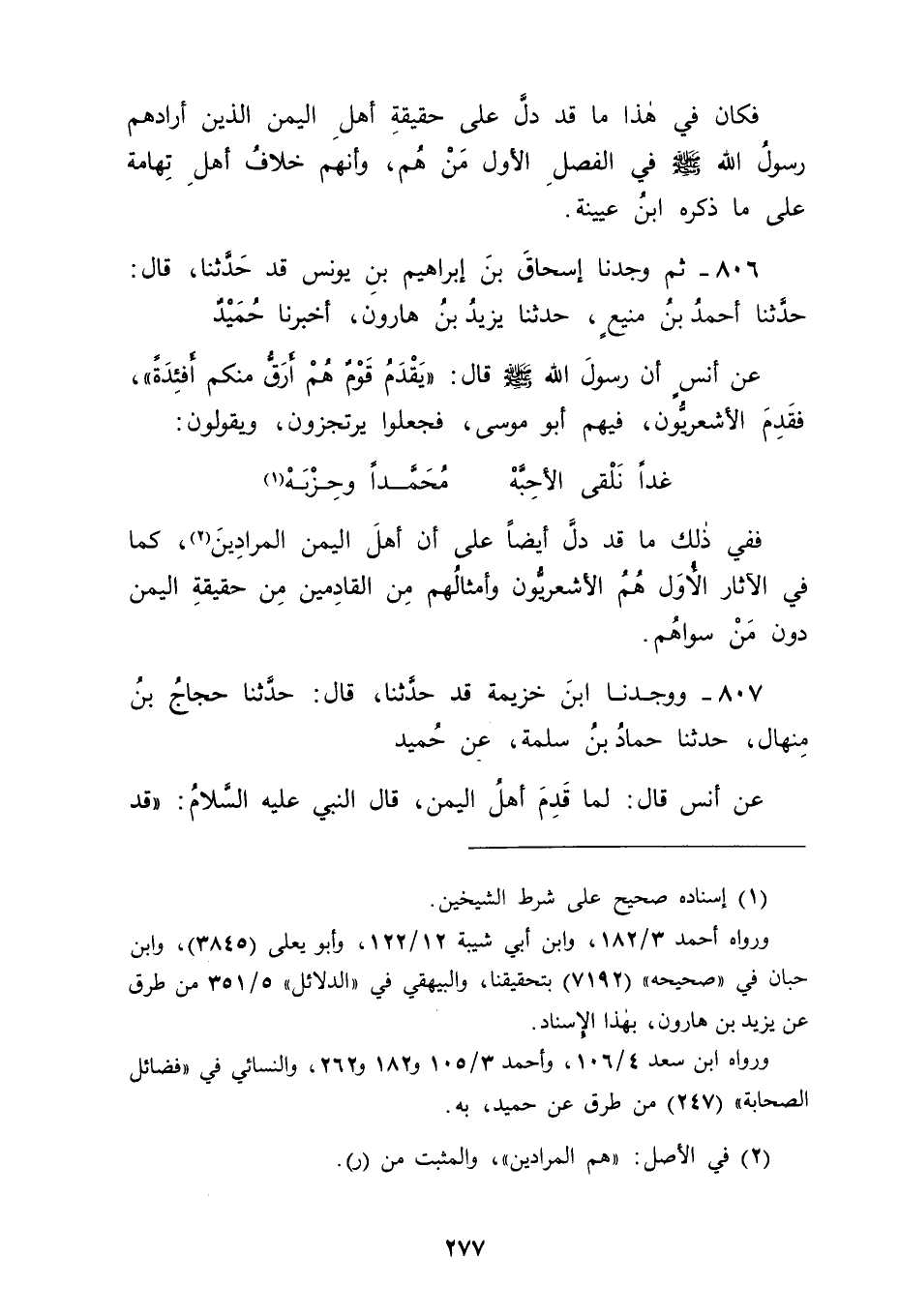 807 - وَوَجَدْنَا ابْنَ خُزَيْمَةَ قَدْ حَدَّثَنَا قَالَ: حَدَّثَنَا حَجَّاجُ بْنُ مِنْهَالٍ، ثَنَا حَمَّادُ بْنُ سَلَمَةَ، عَنْ حُمَيْدٍ، عَنْ أَنَسٍ قَالَ: لَمَّا قَدِمَ أَهْلُ الْيَمَنِ قَالَ النَّبِيُّ عَلَيْهِ السَّلَامُ: " قَدْ -[278]- أَقْبَلَ أَهْلُ الْيَمَنِ هُمْ أَلْيَنُ قُلُوبًا مِنْكُمْ، وَهُمْ أَوَّلُ مَنْ جَاءَ بِالْمُصَافَحَةِ " وَمَا فِي هَذَا الْبَابِ مِنَ الْآثَارِ فَكَثِيرٌ اكْتَفَيْنَا مِنْهَا بِمَا جِئْنَا بِهِ مِنْهَا فِي هَذَا الْبَابِ مِمَّا قَدْ وَضَحَ بِهِ مَا قَدْ ذَكَرْنَاهُ مِنْ حَقِيقَةِ أَهْلِ الْيَمَنِ الْمُرَادِينَ بِمَا فِيهَا وَأَنَّهُمْ لَيْسُوا أَهْلَ تِهَامَةَ كَمَا قَالَ ابْنُ عُيَيْنَةَ , وَاللهَ نَسْأَلُهُ التَّوْفِيقَ