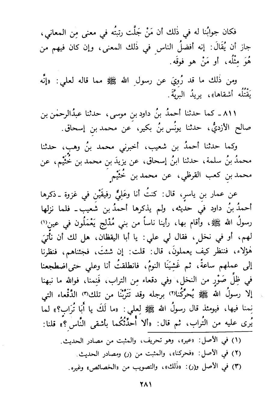 811 - كَمَا حَدَّثَنَا أَحْمَدُ بْنُ دَاوُدَ بْنِ مُوسَى، حَدَّثَنَا عَبْدُ الرَّحْمَنِ بْنُ صَالِحٍ الْأَزْدِيُّ، حَدَّثَنَا يُونُسُ بْنُ بُكَيْرٍ، عَنْ مُحَمَّدِ بْنِ إِسْحَاقَ، وَكَمَا حَدَّثَنَا أَحْمَدُ بْنُ شُعَيْبٍ، أَخْبَرَنِي مُحَمَّدُ بْنُ وَهْبٍ، حَدَّثَنَا مُحَمَّدُ بْنُ سَلَمَةَ، ثَنَا ابْنُ إِسْحَاقَ، عَنْ يَزِيدَ بْنِ مُحَمَّدِ بْنِ خُثَيْمٍ، عَنْ مُحَمَّدِ بْنِ كَعْبٍ الْقُرَظِيِّ، عَنْ مُحَمَّدِ بْنِ خُثَيْمٍ، عَنْ عَمَّارِ بْنِ يَاسِرٍ قَالَ: كُنْتُ أَنَا وَعَلِيٌّ، رَفِيقَيْنِ فِي غَزْوَةٍ ذَكَرَهَا أَحْمَدُ بْنُ دَاوُدَ فِي حَدِيثِهِ وَلَمْ يَذْكُرْهَا أَحْمَدُ بْنُ شُعَيْبٍ فَلَمَّا نَزَلَهَا رَسُولُ اللهِ صَلَّى اللَّهُ عَلَيْهِ وَسَلَّمَ، وَأَقَامَ بِهَا رَأَيْنَا نَاسًا مِنْ بَنِي مُدْلِجٍ يَعْمَلُونَ فِي عَيْنٍ لَهُمْ أَوْ فِي نَخْلٍ، فَقَالَ لِي عَلِيٌّ: يَا أَبَا الْيَقْظَانِ هَلْ لَكَ أَنْ نَأْتِيَ هَؤُلَاءِ فَنَنْظُرَ كَيْفَ يَعْمَلُونَ؟ قَالَ: قُلْتُ إنْ شِئْتَ فَجِئْنَاهُمْ، فَنَظَرْنَا إلَى عَمَلِهِمْ سَاعَةً , ثُمَّ غَشِيَنَا النَّوْمُ فَانْطَلَقْتُ أَنَا وَعَلِيٌّ حَتَّى اضْطَجَعْنَا فِي ظِلِّ صُورٍ مِنَ النَّخْلِ، وَفِي دَقْعَاءَ مِنَ التُّرَابِ فَنِمْنَا فَوَاللهِ مَا نَبَّهَنَا إلَّا رَسُولُ اللهِ صَلَّى اللَّهُ عَلَيْهِ وَسَلَّمَ يُحَرِّكُنَا بِرِجْلِهِ وَقَدْ تَتَرَّبْنَا مِنْ تِلْكَ الدَّقْعَاءِ الَّتِي نِمْنَا فِيهَا فَيَوْمَئِذٍ، قَالَ رَسُولُ اللهِ صَلَّى اللَّهُ عَلَيْهِ وَسَلَّمَ لِعَلِيٍّ: " مَا لَكَ يَا أَبَا تُرَابٍ " لِمَا يَرَى عَلَيْهِ مِنَ التُّرَابِ , ثُمَّ قَالَ: " أَلَا أُحَدِّثُكُمَا بِأَشْقَى النَّاسِ؟ "، قُلْنَا: -[282]- بَلَى يَا رَسُولَ اللهِ قَالَ: " أُحَيْمِرُ ثَمُودَ الَّذِي عَقَرَ النَّاقَةَ، وَالَّذِي يَضْرِبُكَ يَا عَلِيُّ عَلَى هَذِهِ " وَوَضَعَ يَدَهُ عَلَى قَرْنِهِ حَتَّى يَبُلَّ مِنْهَا هَذِهِ وَأَخَذَ بِلِحْيَتِهِ " -[284]- ثُمَّ مِنْ ذَلِكَ أَيْضًا مَا قَدْ رُوِيَ عَنْ عَلِيٍّ مِمَّا لَمْ يُضِفْهُ إلَى النَّبِيِّ عَلَيْهِ السَّلَامُ غَيْرَ أَنَّا نَعْلَمُ أَنَّهُ لَمْ يَقُلْهُ رَأْيًا، وَلَا اسْتِخْرَاجًا، وَلَا اسْتِنْبَاطًا إذْ كَانَ مِثْلُهُ لَا يُقَالُ بِالرَّأْيِ، وَلَا بِالِاسْتِخْرَاجِ، وَلَا بِالِاسْتِنْبَاطِ، وَنُحِيطُ عِلْمًا أَنَّهُ قَالَ ذَلِكَ؛ لِأَخْذِهِ إيَّاهُ عَنْ رَسُولِ اللهِ صَلَّى اللَّهُ عَلَيْهِ وَسَلَّمَ
