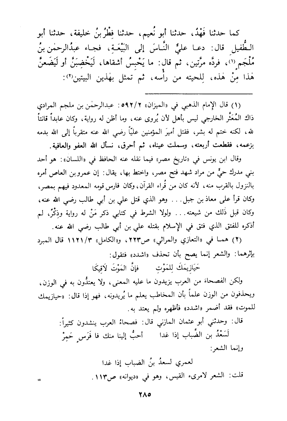كَمَا حَدَّثَنَا فَهْدٌ، حَدَّثَنَا أَبُو نُعَيْمٍ، حَدَّثَنَا فِطْرُ بْنُ خَلِيفَةَ، حَدَّثَنَا أَبُو الطُّفَيْلِ قَالَ: " دَعَا عَلِيٌّ النَّاسَ إلَى الْبَيْعَةِ، فَجَاءَ عَبْدُ الرَّحْمَنِ بْنُ مُلْجَمٍ فَرَدَّهُ مَرَّتَيْنِ , ثُمَّ قَالَ: مَا يَحْبِسُ أَشْقَاهَا لَيَخْضِبَنَّ أَوْ لَيَضَعَنَّ هَذَا مِنْ هَذِهِ لِلِحْيَتِهِ مِنْ رَأْسِهِ , ثُمَّ تَمَثَّلَ بِهَذَيْنِ الْبَيْتَيْنِ: