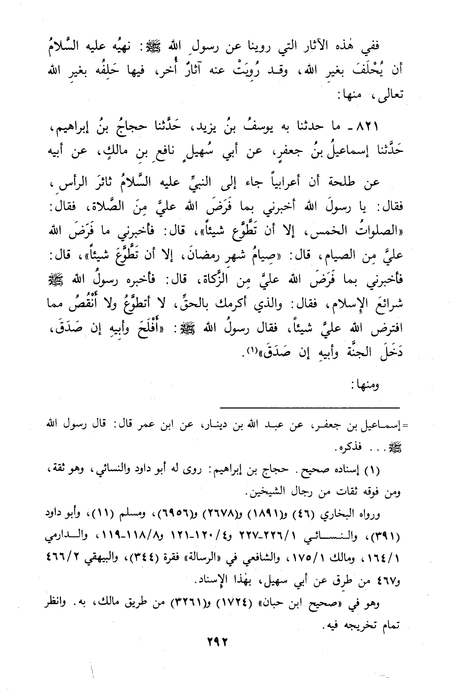 821 - مَا حَدَّثَنَا بِهِ يُوسُفُ بْنُ يَزِيدَ حَدَّثَنَا حَجَّاجُ بْنُ إبْرَاهِيمَ، حَدَّثَنَا إسْمَاعِيلُ بْنُ جَعْفَرٍ، عَنْ أَبِي سُهَيْلٍ نَافِعِ بْنِ مَالِكٍ، عَنْ أَبِيهِ، عَنْ طَلْحَةَ أَنَّ أَعْرَابِيًّا، جَاءَ إلَى النَّبِيِّ عَلَيْهِ السَّلَامُ ثَائِرَ الرَّأْسِ، فَقَالَ: يَا رَسُولَ اللهِ أَخْبِرْنِي بِمَا فَرَضَ اللهُ عَلَيَّ مِنَ الصَّلَاةِ، فَقَالَ: " الصَّلَوَاتُ الْخَمْسُ إلَّا أَنْ تَطَوَّعَ شَيْئًا " قَالَ: فَأَخْبِرْنِي مَا فَرَضَ اللهُ عَلَيَّ مِنَ الصِّيَامِ، قَالَ: " صِيَامُ شَهْرِ رَمَضَانَ إلَّا أَنْ تَطَوَّعَ شَيْئًا " قَالَ: فَأَخْبِرْنِي بِمَا فَرَضَ اللهُ عَلَيَّ مِنَ الزَّكَاةِ قَالَ: فَأَخْبَرَهُ رَسُولُ اللهِ صَلَّى اللَّهُ عَلَيْهِ وَسَلَّمَ شَرَائِعَ الْإِسْلَامِ فَقَالَ: وَالَّذِي أَكْرَمَكَ بِالْحَقِّ لَا أَتَطَوَّعُ، وَلَا أَنْقُصُ مِمَّا افْتَرَضَ اللهُ عَلَيَّ شَيْئًا، فَقَالَ رَسُولُ اللهِ صَلَّى اللَّهُ عَلَيْهِ وَسَلَّمَ: " أَفْلَحَ، وَأَبِيهِ إنْ صَدَقَ دَخَلَ الْجَنَّةَ وَأَبِيهِ إنْ صَدَقَ "