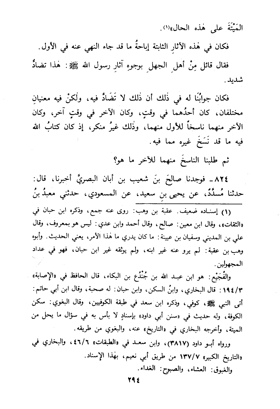 824 - فَوَجَدْنَا صَالِحَ بْنَ شُعَيْبِ بْنِ أَبَانَ الْبَصْرِيَّ أَخْبَرَنَا قَالَ: حَدَّثَنَا مُسَدَّدٌ، عَنْ يَحْيَى بْنِ سَعِيدٍ، عَنِ الْمَسْعُودِيِّ، حَدَّثَنِي مَعْبَدُ بْنُ -[295]- خَالِدٍ، عَنْ عَبْدِ اللهِ بْنِ يَسَارٍ، عَنْ قُتَيْلَةَ بِنْتِ صَيْفِيٍّ الْجُهَنِيَّةِ قَالتْ: أَتَى حَبْرٌ مِنَ الْأَحْبَارِ إلَى رَسُولِ اللهِ صَلَّى اللَّهُ عَلَيْهِ وَسَلَّمَ فَقَالَ: يَا مُحَمَّدُ نِعْمَ الْقَوْمُ أَنْتُمْ لَوْلَا أَنَّكُمْ تُشْرِكُونَ، فَقَالَ: " سُبْحَانَ اللهِ " قَالَ: إنَّكُمْ تَقُولُونَ إذَا حَلَفْتُمْ وَالْكَعْبَةِ قَالَ: فَأَمْهَلَ رَسُولُ اللهِ صَلَّى اللَّهُ عَلَيْهِ وَسَلَّمَ شَيْئًا، ثُمَّ قَالَ: " إنَّهُ قَدْ قَالَ لِمَنْ حَلَفَ فَلْيَحْلِفْ بِرَبِّ الْكَعْبَةِ " فَكَانَ فِي هَذَا الْحَدِيثِ ذِكْرُ سَبَبِ النَّهْيِ مِنْ رَسُولِ اللهِ صَلَّى اللَّهُ عَلَيْهِ وَسَلَّمَ عَنَ الْحَلِفِ بِغَيْرِ اللهِ تَعَالَى، وَكَانَ فِي ذَلِكَ مَا قَدْ دَلَّ عَلَى أَنَّ الْمُتَأَخِّرَ مِنَ الْمَعْنَيَيْنِ الْمُخْتَلِفِينَ اللَّذَيْنِ ذَكَرْنَاهُمَا فِي هَذَا الْبَابِ هُوَ النَّهْيُ عَنَ الْحَلِفِ بِغَيْرِ اللهِ تَعَالَى لَا الْإِبَاحَةُ لَهُ فَبَانَ بِحَمْدِ اللهِ بِمَا ذَكَرْنَا خِلَافُ مَا تَوَهَّمَ هَذَا الْجَاهِلُ، وَاللهَ نَسْأَلُهُ التَّوْفِيقَ