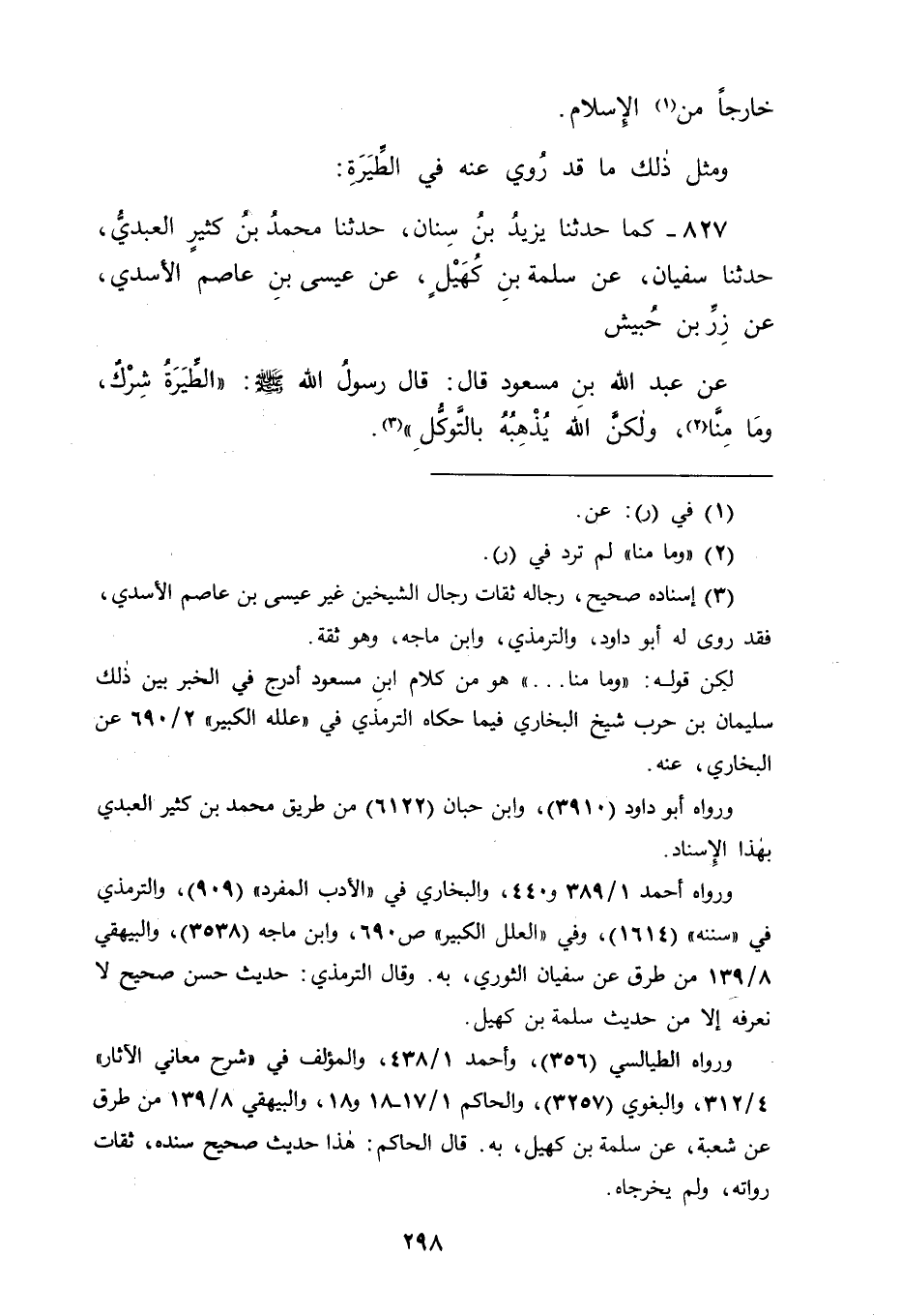 827 - كَمَا حَدَّثَنَا يَزِيدُ بْنُ سِنَانٍ، حَدَّثَنَا مُحَمَّدُ بْنُ كَثِيرٍ الْعَبْدِيُّ، حَدَّثَنَا سُفْيَانُ، عَنْ سَلَمَةَ بْنِ كُهَيْلٍ، عَنْ عِيسَى بْنِ عَاصِمٍ الْأَسَدِيِّ، عَنْ زِرِّ بْنِ حُبَيْشٍ، عَنْ عَبْدِ اللهِ بْنِ مَسْعُودٍ قَالَ: قَالَ رَسُولُ اللهِ صَلَّى اللَّهُ عَلَيْهِ وَسَلَّمَ: " الطِّيَرَةُ شِرْكٌ، وَمَا مِنَّا وَلَكِنَّ اللهَ يُذْهِبُهُ بِالتَّوَكُّلِ " -[299]-