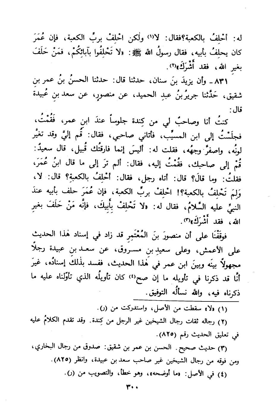 831 - وَأَنَّ يَزِيدَ بْنَ سِنَانٍ حَدَّثَنَا قَالَ: حَدَّثَنَا الْحَسَنُ بْنُ عُمَرَ بْنِ شَقِيقٍ، حَدَّثَنَا جَرِيرُ بْنُ عَبْدِ الْحَمِيدِ، عَنْ مَنْصُورٍ، عَنْ سَعْدِ بْنِ عُبَيْدَةَ قَالَ: كُنْتُ أَنَا وَصَاحِبٌ لِي مِنْ كِنْدَةَ جُلُوسًا عِنْدَ ابْنِ عُمَرَ فَقُمْتُ فَجَلَسْتُ إلَى ابْنِ الْمُسَيِّبِ فَأَتَانِي صَاحِبِي فَقَالَ: قُمْ إلَيَّ، وَقَدْ تَغَيَّرَ لَوْنُهُ وَاصْفَرَّ وَجْهُهُ، فَقُلْتُ لَهُ: أَلَيْسَ إنَّمَا فَارَقْتُكَ قُبَيْلُ؟ قَالَ سَعِيدٌ: قُمْ إلَى صَاحِبِكَ، فَقُمْتُ إلَيْهِ، فَقَالَ: أَلَمْ تَرَ إلَى مَا قَالَ ابْنُ عُمَرَ؟ فَقُلْتُ: وَمَا قَالَ؟ قَالَ: أَتَاهُ رَجُلٌ فَقَالَ: أَحْلِفُ بِالْكَعْبَةِ؟ قَالَ لَا، وَلِمَ تَحْلِفُ بِالْكَعْبَةِ؟ احْلِفْ بِرَبِّ الْكَعْبَةِ فَإِنَّ عُمَرَ حَلَفَ بِأَبِيهِ عِنْدَ النَّبِيِّ عَلَيْهِ السَّلَامُ فَقَالَ لَهُ: " لَا تَحْلِفْ بِأَبِيكَ، فَإِنَّهُ مَنْ حَلَفَ بِغَيْرِ اللهِ فَقَدْ أَشْرَكَ " فَوَقَفْنَا عَلَى أَنَّ مَنْصُورَ بْنَ الْمُعْتَمِرِ قَدْ زَادَ فِي إسْنَادِ هَذَا الْحَدِيثِ عَلَى الْأَعْمَشِ، وَعَلَى سَعِيدِ بْنِ مَسْرُوقٍ، عَنْ سَعْدِ بْنِ عُبَيْدَةَ رَجُلًا مَجْهُولًا بَيْنَهُ وَبَيْنَ ابْنِ عُمَرَ فِي هَذَا الْحَدِيثِ فَفَسَدَ بِذَلِكَ إسْنَادُهُ غَيْرَ أَنَّا قَدْ ذَكَرْنَا فِي تَأْوِيلِهِ مَا إنْ صَحَّ كَانَ تَأْوِيلُهُ الَّذِي تَأَوَّلْنَاهُ عَلَيْهِ مَا ذَكَرْنَاهُ فِيهِ , وَاللهَ نَسْأَلُهُ التَّوْفِيقَ