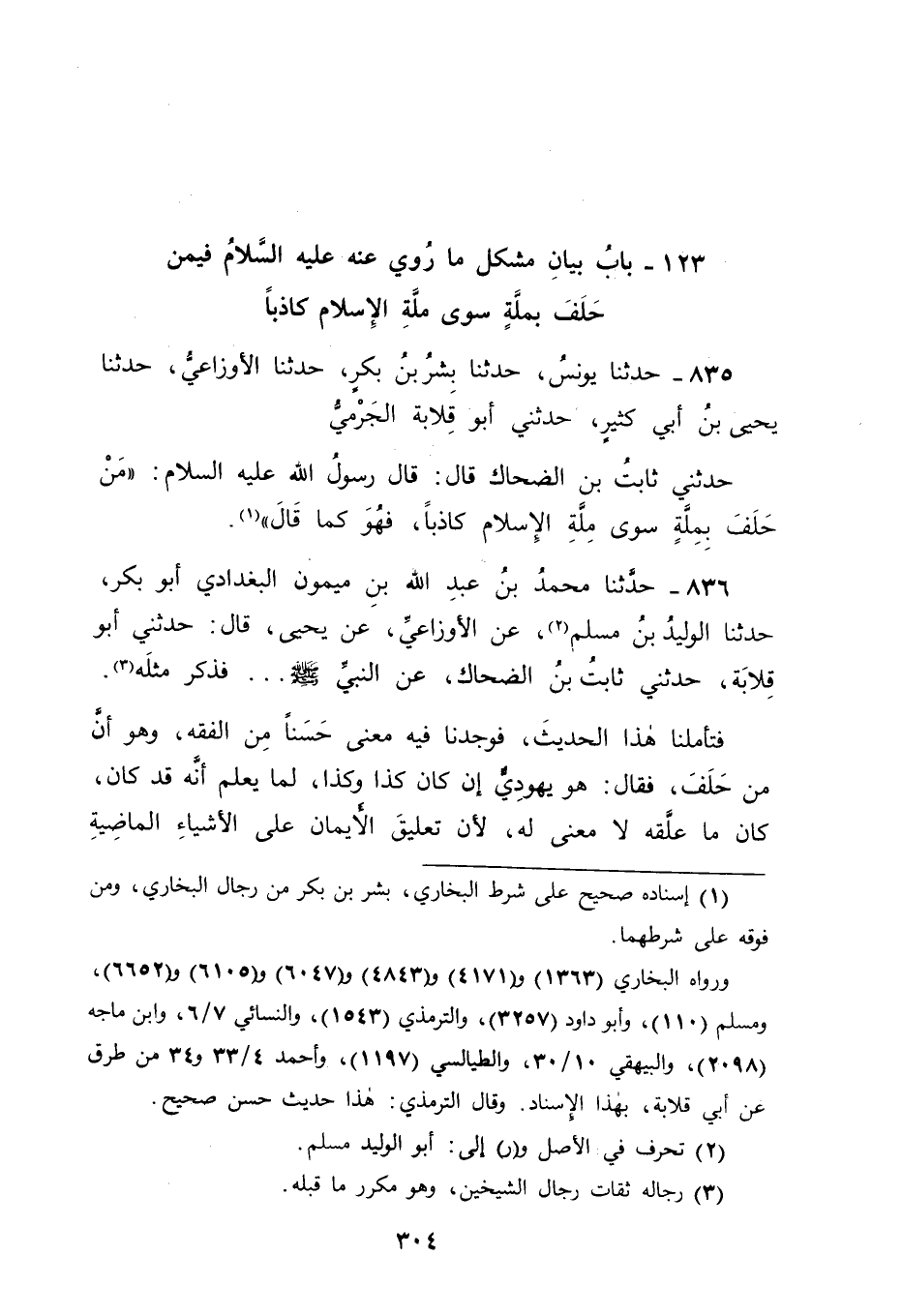 835 - حَدَّثَنَا يُونُسُ، حَدَّثَنَا بِشْرُ بْنُ بَكْرٍ، حَدَّثَنَا الْأَوْزَاعِيُّ، حَدَّثَنِي يَحْيَى بْنُ أَبِي كَثِيرٍ، حَدَّثَنِي أَبُو قِلَابَةَ الْجَرْمِيُّ، حَدَّثَنِي ثَابِتُ بْنُ الضَّحَّاكِ قَالَ: قَالَ رَسُولُ اللهِ عَلَيْهِ السَّلَامُ: " مَنْ حَلَفَ بِمِلَّةٍ سِوَى مِلَّةِ الْإِسْلَامِ كَاذِبًا فَهُوَ كَمَا قَالَ "