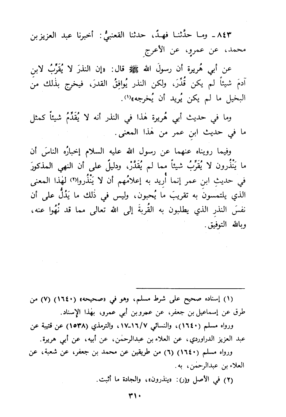 843 - وَمَا حَدَّثَنَا فَهْدٌ، حَدَّثَنَا الْقَعْنَبِيُّ، أَخْبَرَنَا عَبْدُ الْعَزِيزِ بْنُ مُحَمَّدٍ، عَنْ عَمْرٍو، عَنِ الْأَعْرَجِ، عَنْ أَبِي هُرَيْرَةَ، أَنَّ رَسُولَ اللهِ صَلَّى اللَّهُ عَلَيْهِ وَسَلَّمَ قَالَ: " إنَّ النَّذْرَ لَا يُقَرِّبُ لِابْنِ آدَمَ شَيْئًا لَمْ يَكُنْ قُدِّرَ وَلَكِنِ النَّذْرُ يُوَافِقُ الْقَدَرَ فَيُخْرِجُ بِذَلِكَ مِنَ الْبَخِيلِ مَا لَمْ يَكُنْ يُرِيدُ أَنْ يُخْرِجَهُ " وَمَا فِي حَدِيثِ أَبِي هُرَيْرَةَ هَذَا فِي النَّذْرِ أَنَّهُ لَا يُقَدِّمُ شَيْئًا كَمِثْلِ مَا فِي حَدِيثِ ابْنِ عُمَرَ مِنْ هَذَا الْمَعْنَى. وَفِيمَا رَوَيْنَاهُ عَنْهُمَا عَنْ رَسُولِ اللهِ عَلَيْهِ السَّلَامُ إخْبَارُهُ النَّاسَ أَنَّ مَا يَنْذُرُونَ لَا يُقَرِّبُ شَيْئًا مِمَّا لَمْ يُقَدَّرْ، وَدَلِيلٌ عَلَى أَنَّ النَّهْيَ الْمَذْكُورَ فِي حَدِيثِ ابْنِ عُمَرَ إنَّمَا أُرِيدَ بِهِ إعْلَامُهُمْ أَنْ لَا يَنْذُرُوا لِهَذَا الْمَعْنَى الَّذِي يَلْتَمِسُونَ بِهِ تَقْرِيبَ مَا يُحِبُّونَ وَلَيْسَ فِي ذَلِكَ مَا يَدُلُّ عَلَى أَنَّ نَفْسَ النَّذْرِ الَّذِي يَطْلُبُونَ بِهِ الْقُرْبَةَ إلَى اللهِ تَعَالَى مِمَّا قَدْ نُهُوا عَنْهُ، وَبِاللهِ التَّوْفِيقُ