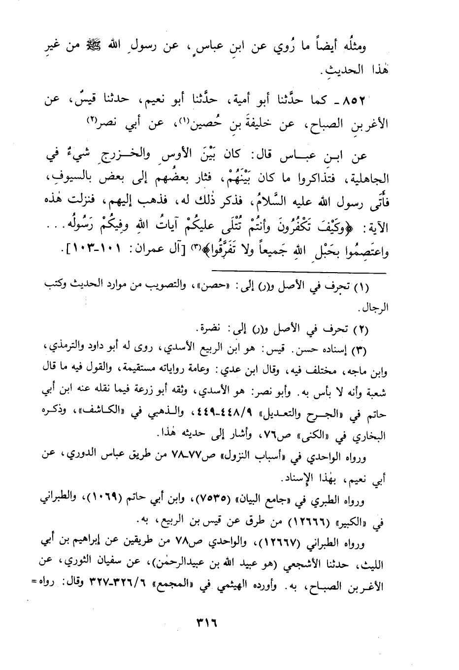 852 - كَمَا حَدَّثَنَا أَبُو أُمَيَّةَ، حَدَّثَنَا أَبُو نُعَيْمٍ، حَدَّثَنَا قَيْسٌ، عَنِ الْأَغَرِّ بْنِ الصَّبَّاحِ، عَنْ خَلِيفَةَ بْنِ حُصَيْنٍ، عَنْ أَبِي نَصْرٍ، عَنِ ابْنِ عَبَّاسٍ قَالَ: " كَانَ بَيْنَ الْأَوْسِ وَالْخَزْرَجِ شَيْءٌ فِي الْجَاهِلِيَّةِ فَتَذَاكَرُوا مَا كَانَ بَيْنَهُمْ، فَثَارَ بَعْضُهُمْ إلَى بَعْضٍ بِالسُّيُوفِ، فَأُتِيَ رَسُولُ اللهِ عَلَيْهِ السَّلَامُ فَذُكِرَ ذَلِكَ لَهُ فَذَهَبَ إلَيْهِمْ فَنَزَلَتْ هَذِهِ الْآيَةُ: {وَكَيْفَ تَكْفُرُونَ وَأَنْتُمْ تُتْلَى عَلَيْكُمْ آيَاتُ اللهِ وَفِيكُمْ رَسُولُهُ} [آل عمران: 101] ، {وَاعْتَصِمُوا بِحَبْلِ اللهِ جَمِيعًا وَلَا تَفَرَّقُوا} [آل عمران: 103] " -[317]- فَلَمْ يَكُنْ بِمَا كَانَ مِنْهُمْ مِنَ الْقِتَالِ مِمَّا أَنْزَلَ اللهُ تَعَالَى عِنْدَهُ هَذِهِ الْآيَةَ الَّتِي ذَكَرَ فِيهَا مَا كَانَ مِنْهُمْ بِالْكُفْرِ عَلَى الْكُفْرِ بِاللهِ تَعَالَى، وَلَكِنْ كَانَ عَلَى تَغْطِيَتِهِمْ مَا كَانُوا عَلَيْهِ قَبْلَ ذَلِكَ مِنَ الْأُلْفَةِ وَالْأُخُوَّةِ، حَتَّى إذَا كَانَ مِنْهُمْ مَا كَانَ مِنْهُمْ مِنْ ذَلِكَ فَسُمِّيَ كُفْرًا لَا يُرَادُ بِهِ الْكُفْرُ بِاللهِ عَزَّ وَجَلَّ، وَلَكِنَّ الْكُفْرَ الَّذِي ذَكَرْنَاهُ سِوَاهُ. وَمِثْلُ ذَلِكَ مَا قَدْ رُوِيَ عَنِ ابْنِ عَبَّاسٍ فِي تَأْوِيلِهِ قَوْلِ اللهِ تَعَالَى: {وَمَنْ لَمْ يَحْكُمْ -[318]- بِمَا أَنْزَلَ اللهُ فَأُولَئِكَ هُمُ الْكَافِرُونَ} [المائدة: 44] عَلَى مَا تَأَوَّلَهُ عَلَيْهِ