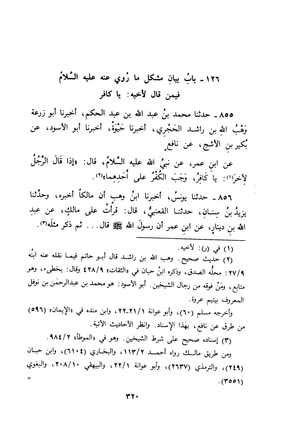 بَابُ بَيَانِ مُشْكِلِ مَا رُوِيَ عَنْهُ عَلَيْهِ السَّلَامُ فِيمَنْ قَالَ لِأَخِيهِ: يَا كَافِرُ