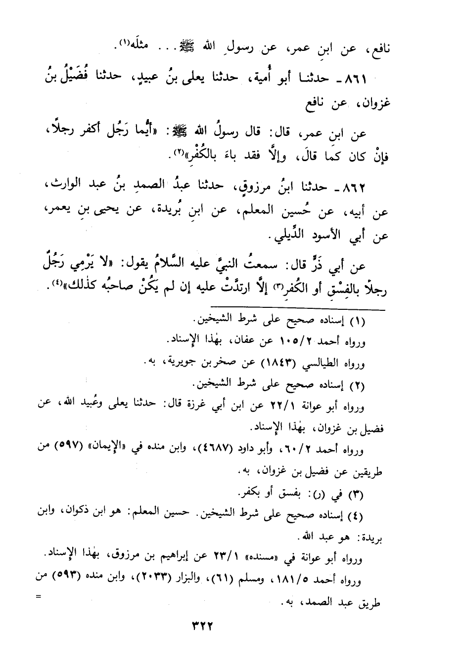 861 - حَدَّثَنَا أَبُو أُمَيَّةَ، حَدَّثَنَا يَعْلَى بْنُ عُبَيْدٍ، حَدَّثَنَا فُضَيْلُ بْنُ غَزْوَانَ، عَنْ نَافِعٍ، عَنِ ابْنِ عُمَرَ قَالَ: قَالَ رَسُولُ اللهِ صَلَّى اللَّهُ عَلَيْهِ وَسَلَّمَ: " أَيُّمَا رَجُلٍ أَكْفَرَ رَجُلًا فَإِنْ كَانَ كَمَا قَالَ، وَإِلَّا فَقَدْ بَاءَ بِالْكُفْرِ "