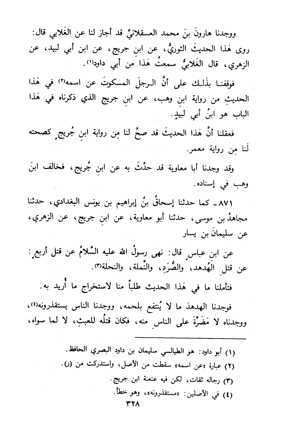 871 - كَمَا حَدَّثَنَا إِسْحَاقُ بْنُ إبْرَاهِيمَ بْنِ يُونُسَ الْبَغْدَادِيُّ، حَدَّثَنَا مُجَاهِدُ بْنُ مُوسَى، حَدَّثَنَا أَبُو مُعَاوِيَةَ، عَنِ ابْنِ جُرَيْجٍ، عَنِ الزُّهْرِيِّ، عَنْ سُلَيْمَانَ بْنِ يَسَارٍ، عَنِ ابْنِ عَبَّاسٍ قَالَ: " نَهَى رَسُولُ اللهِ عَلَيْهِ السَّلَامُ عَنْ قَتْلِ أَرْبَعٍ: عَنْ قَتْلِ الْهُدْهُدِ، وَالصُّرَدِ، وَالنَّمْلَةِ، وَالنَّحْلَةِ " فَتَأَمَّلْنَا مَا فِي هَذَا الْحَدِيثَ طَلَبًا مِنَّا؛ لِاسْتِخْرَاجِ مَا أُرِيدَ بِهِ فَوَجَدْنَا الْهُدْهُدَ مَا لَا يُنْتَفَعُ بِلَحْمِهِ، وَوَجَدْنَا النَّاسَ يَسْتَقْذِرُونَهُ، وَوَجَدْنَاهُ لَا مَضَرَّةَ عَلَى النَّاسِ مِنْهُ فَكَانَ قَتْلُهُ لِلْعَبَثِ لَا لِمَا سِوَاهُ، -[329]- وَذَلِكَ مَنْهِيٌّ عَنْهُ كَمَا قَدْ رُوِيَ عَنْ رَسُولِ اللهِ صَلَّى اللَّهُ عَلَيْهِ وَسَلَّمَ فِيمَا قُتِلَ مِنْ هَذَا الْجِنْسِ بِغَيْرِ حَقِّهِ